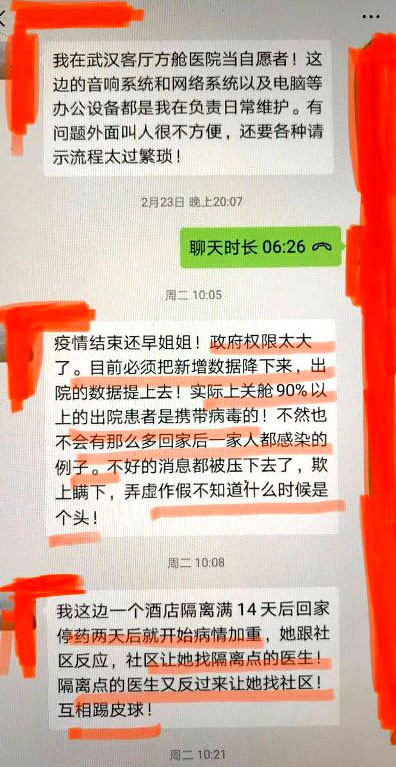![]() 图3:武汉一个方舱医院的志愿者2月下旬揭露数据造假(微信截图) |