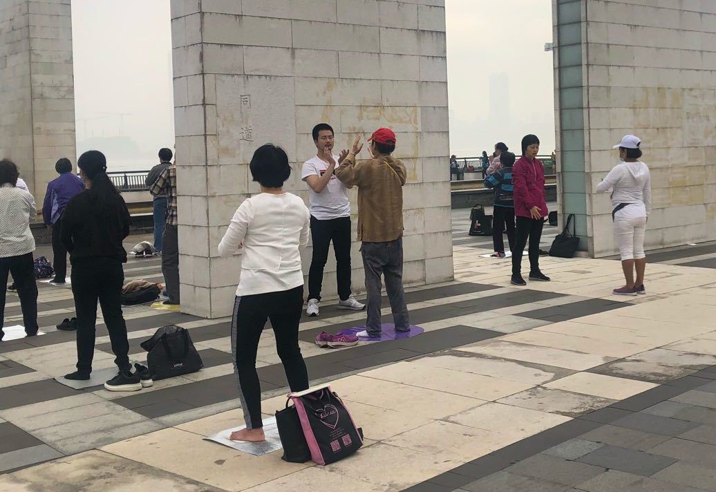 ![]() 图2:集体炼功现场有民众来学炼法轮功。 |