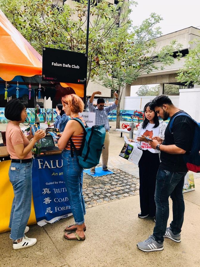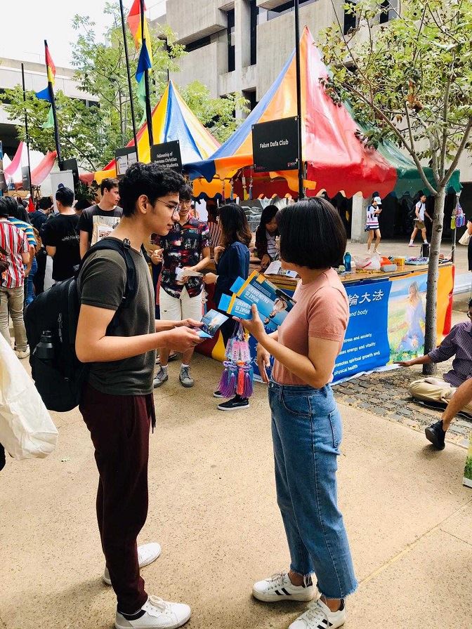 参加迎新周的学生杰克(Jack)说,他之前已经了解了法轮功,并听说了在中国对法轮功的迫害。他表示:中共似乎不希望人们传播“真、善、忍”这种良好的价值观,我们应该在脸书这样的社交媒体上传播真相。