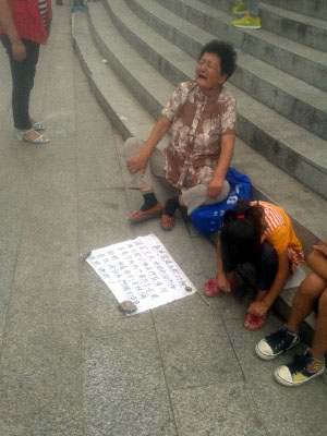 由于中共恶徒相互推诿不放人,逼得纪保山的妻子石银雪只好抱着两个月的孩子沿街乞讨,把丈夫因炼法轮功做好人、被方正县国保大队绑架抄家、造成妻子和两个孩子无法生活、没有经济来源的处境和目前的悲惨遭遇,写在一块黄布上,呼吁各界善良的人们给予关注。
