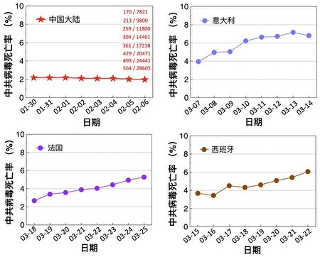 从图二(左上)可以看出,疫情爆发初期的连续8天,中共公布的中共病毒的死亡率呈一条直线,几乎没有误差。相比之下,西方民主国家公布出的中共病毒的死亡率都会有正常的浮动(右上:意大利;左下:法国;右下:西班牙)。为了公平对比,其它三个国家选择的起始时间都是在各自国家疫情爆发初期,死亡人数在200左右的时候。