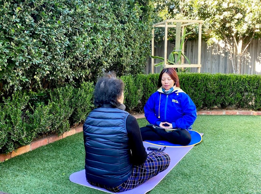 ![]() 图:墨尔本一家理疗及康复联合保健中心的老板范梅(Mai Pham)女士和母亲一起炼法轮功第五套功法——神通加持法。 |