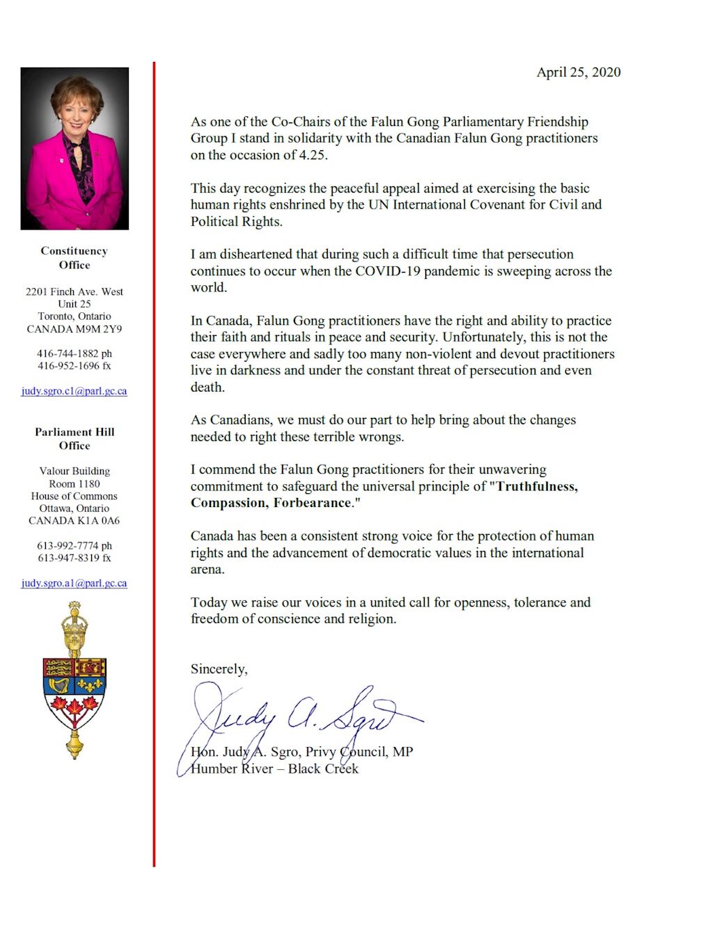 加拿大自由党国会议员、国会法轮功之友共同主席朱迪·思格若(Judy Sgro)在电子邮件来信中说:“在纪念四·二五之际,我和加拿大的法轮功学员站在一起。”