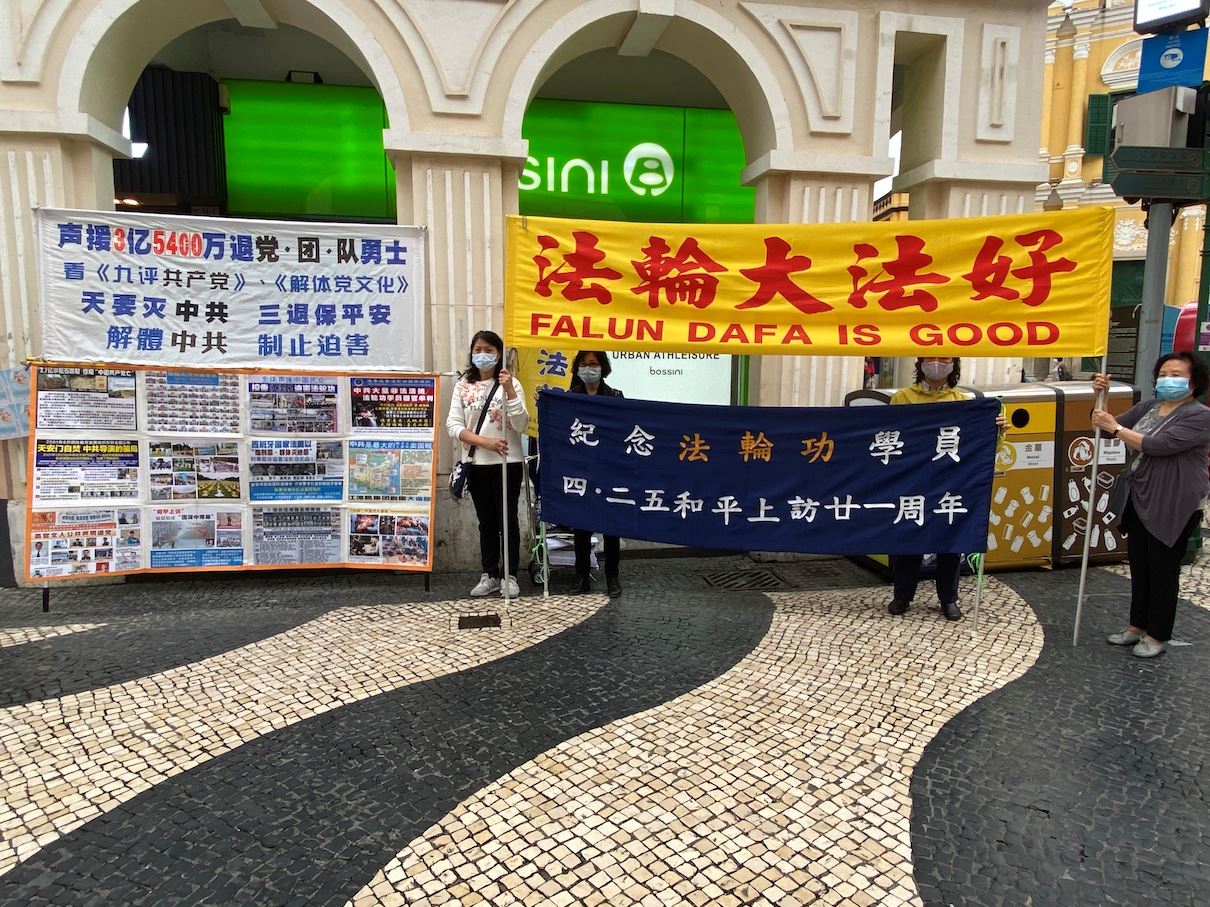 自一九九九年七月二十日,中共开始迫害法轮功开始,澳门法轮功学员即穿梭于澳门的大街小巷,派发真相资料。本地居民大都默默接过学员手中的资料,极少发生恶言相向、甚至举报的事件。