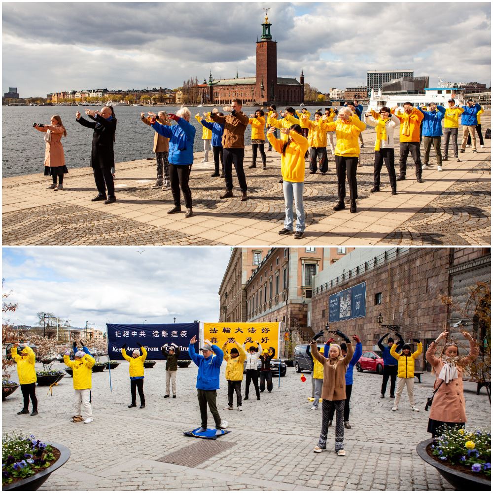 ![]() 图7:瑞典法轮功学员在斯德哥尔摩市中心国会大厦旁的钱币广场、斯德哥尔摩市政厅旁炼功、传播真相 |