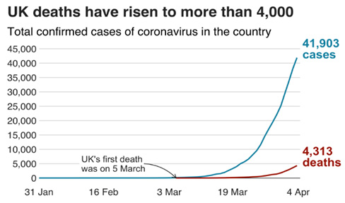 ![]() 图 英国的中共病毒感染人数(蓝线)和死亡人数(红线)曲线 |