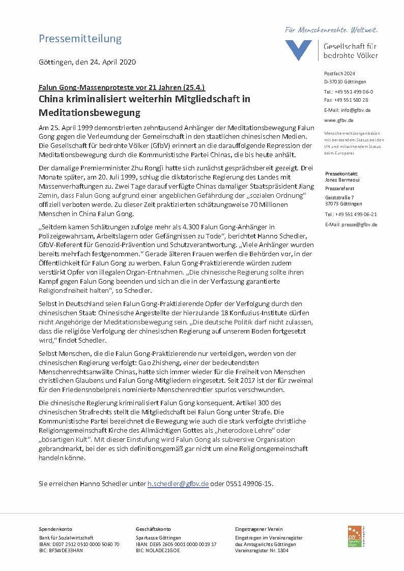 协会的预防种族灭绝和负责保护的顾问赛德勒(Hanno Schedler)在文章中说:“从那之后,估计至少有四千三百法轮功学员死于警察拘留所、劳教所或监狱。”“很多成员多次被逮捕。”法轮功越来越成为非法摘取器官的重要牺牲品。“中共政府应该结束对法轮功的打压,保证其宪法制定的宗教自由。”