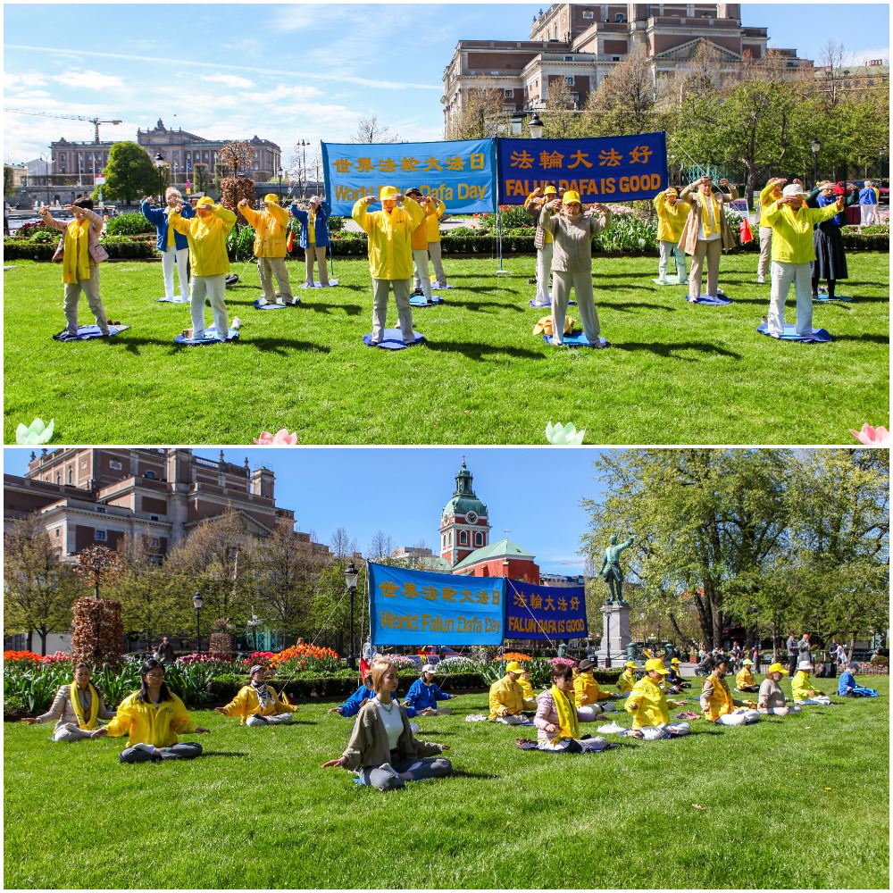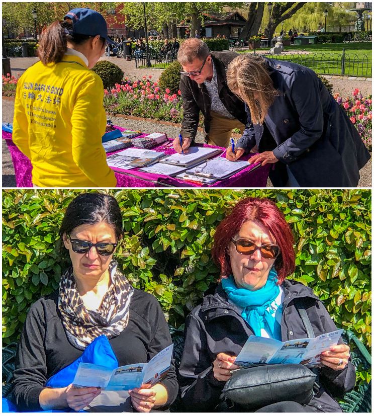 在活动现场法轮功学员集体炼功、向世人展示功法的场面格外引人注目。两位西人学员通过扬声器,用瑞典语、英语向当地民众介绍法轮大法弘传全世界一百多个国家和地区的盛况,同时揭露中共造谣污蔑法轮功以及活摘法轮功学员器官牟取暴利的罪恶。当天由于受中共病毒疫情的影响,皇家花园的人流比往年明显要减少了很多,但悠扬悦耳的炼功音乐、缓、慢、圆炼功动作,祥和、充满能量的炼功场面,吸引了很多来享受阳光的路人驻足观看,并不由自主地拿出手机拍照、录像,有的站在真相展板前仔细阅读后,又上前和学员交谈。