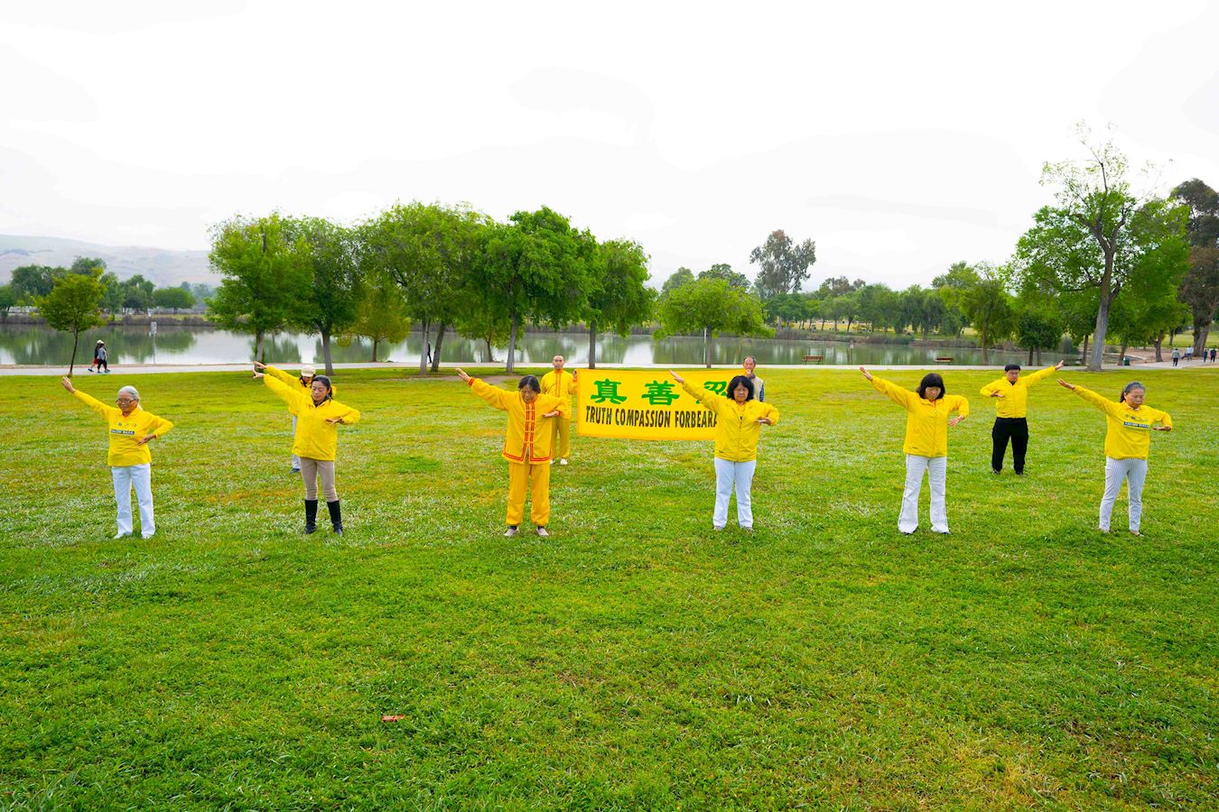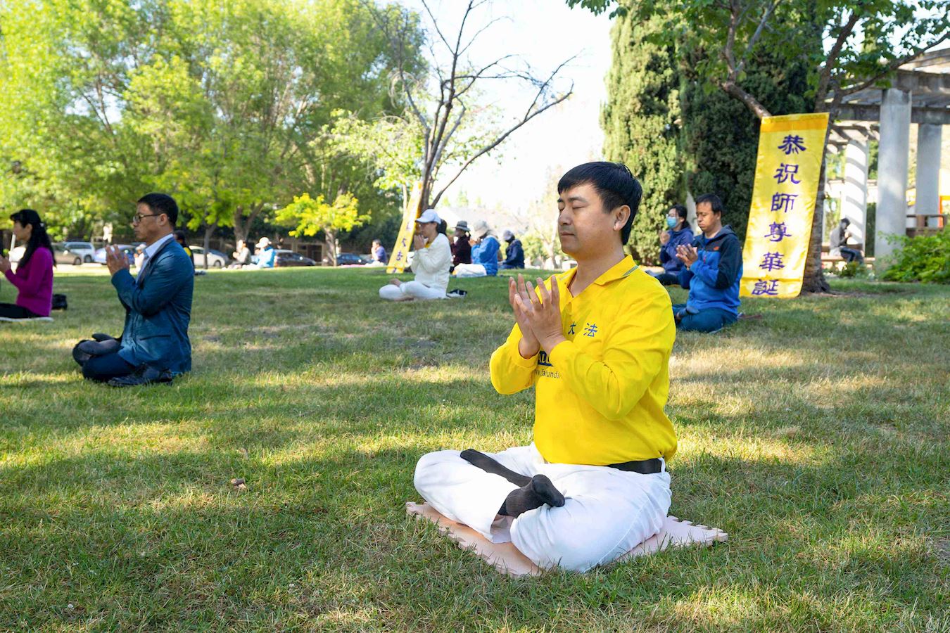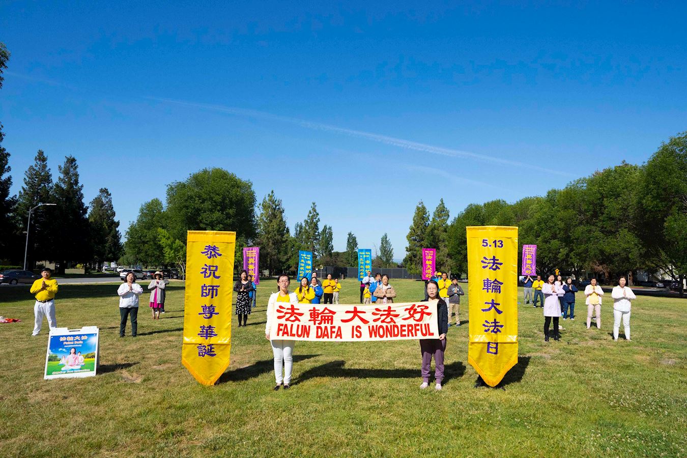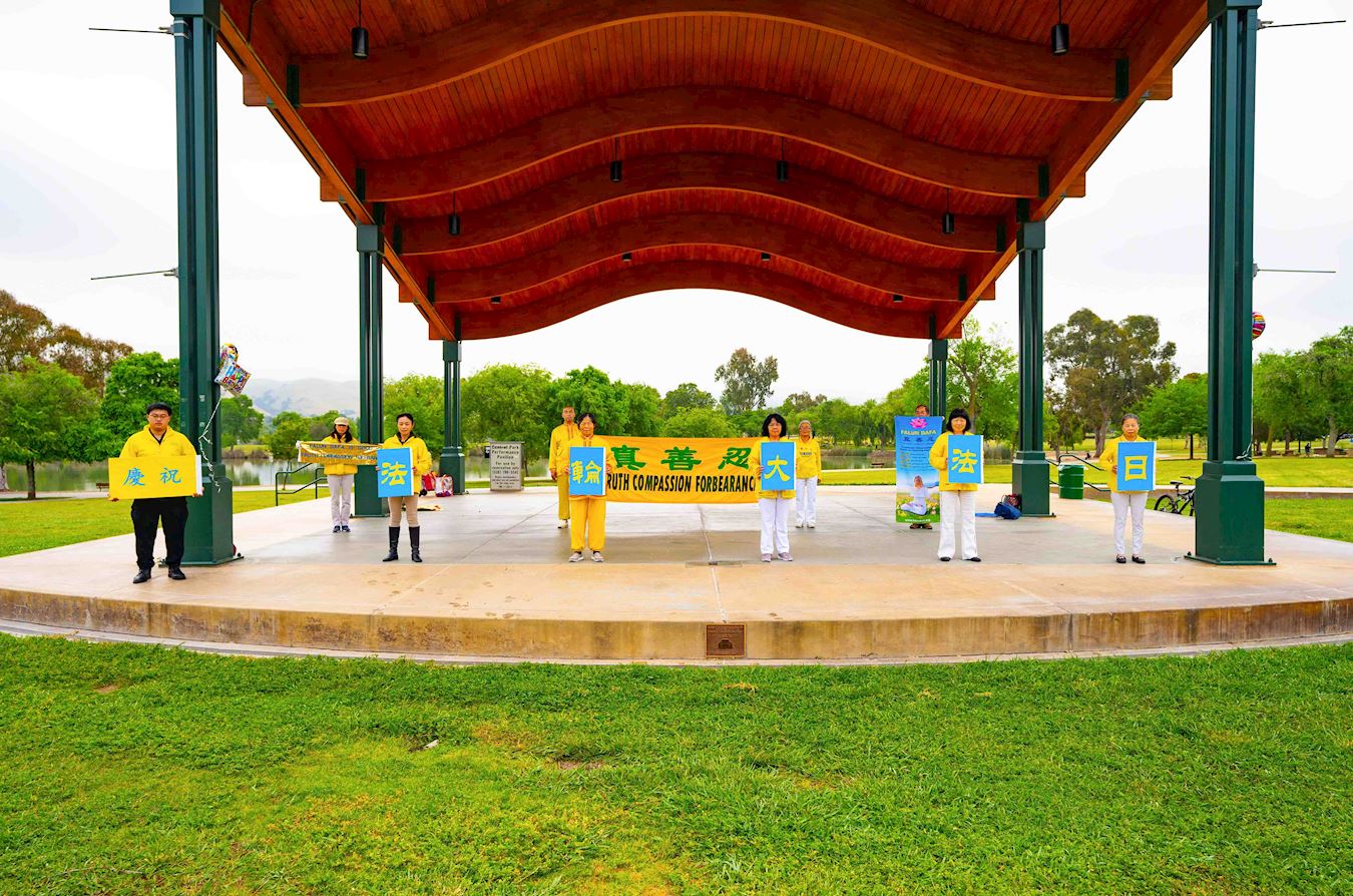 五月九日,旧金山东湾和南湾的部份法轮功学员在当地的公园炼功,庆祝世界法轮大法日,恭贺师父华诞,齐声念颂:“恭祝师父生日快乐!”“法轮大法好!”“真善忍好!”表达学员对师父的崇敬和感恩。