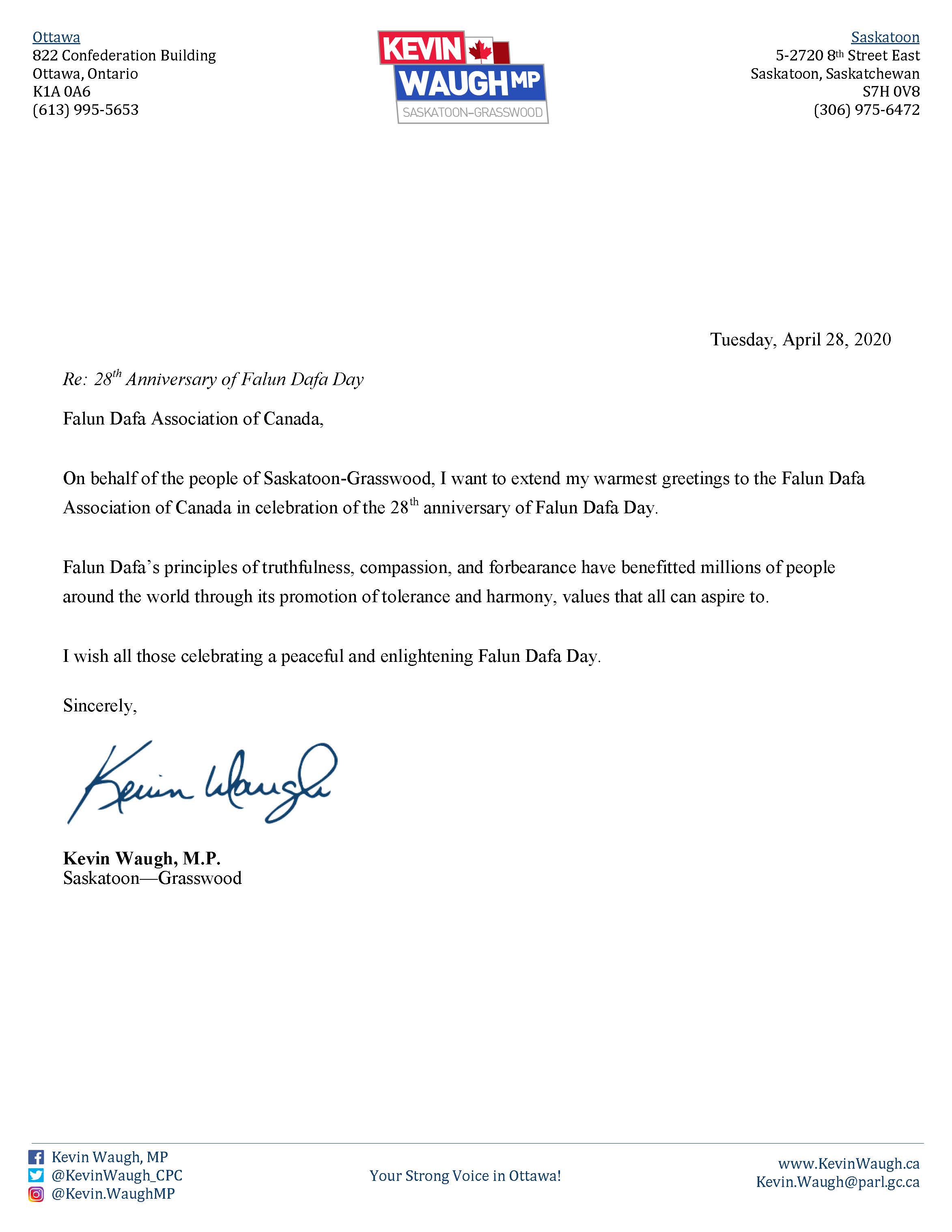 加拿大联邦国会议员凯文·沃(Kevin Waugh)发来贺信说:“法轮大法弘扬容忍和平和,大法的标准‘真、善、忍’已让全世界亿万人受益,让所有人都感受到启迪。”“我祝愿法轮大法日庆祝活动平和并能启悟人心。”“我要向加拿大法轮大法学会表达我最真心的祝贺。恭祝法轮大法传世二十八周年!”