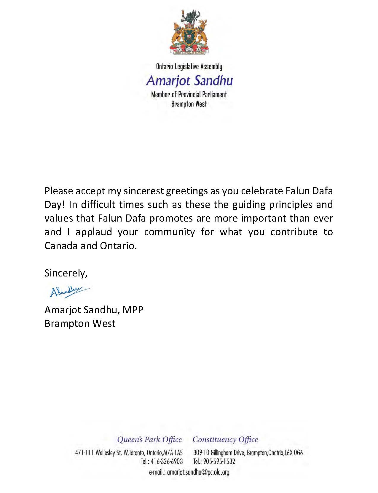 安省省议员阿马尔霍特·桑德赫(Amarjot Sandhu)寄来贺信说,在目前这个艰难的时刻,法轮大法倡导的真善忍指导原则比任何时期都更重要。我为你们社区为安省和加拿大所做的一切鼓掌。