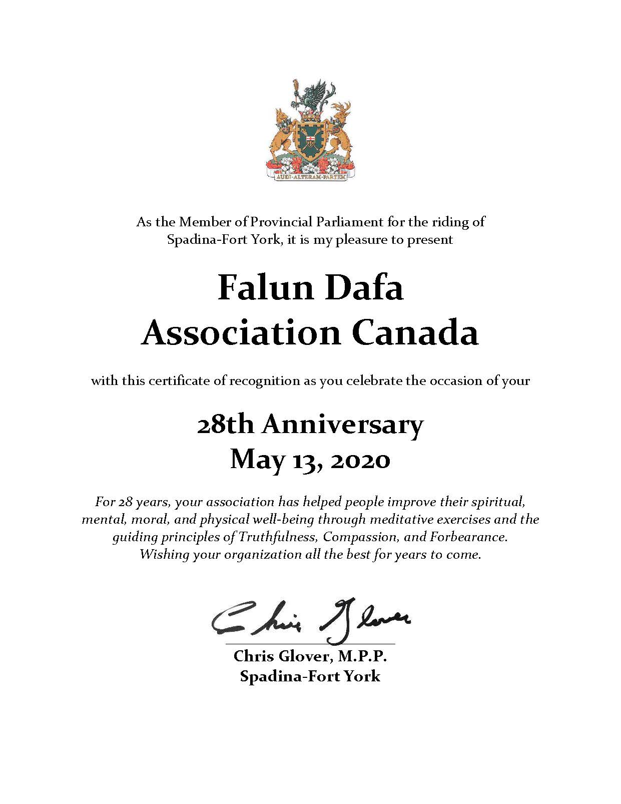 安省新民主党省议员克里斯·格洛弗(Chris Glover)贺信里写道:作为Spadina-Fort York选区的省议员,我非常荣幸地向加拿大法轮大法协会授予嘉奖令,庆贺2020年5月13日,第21个法轮大法日。