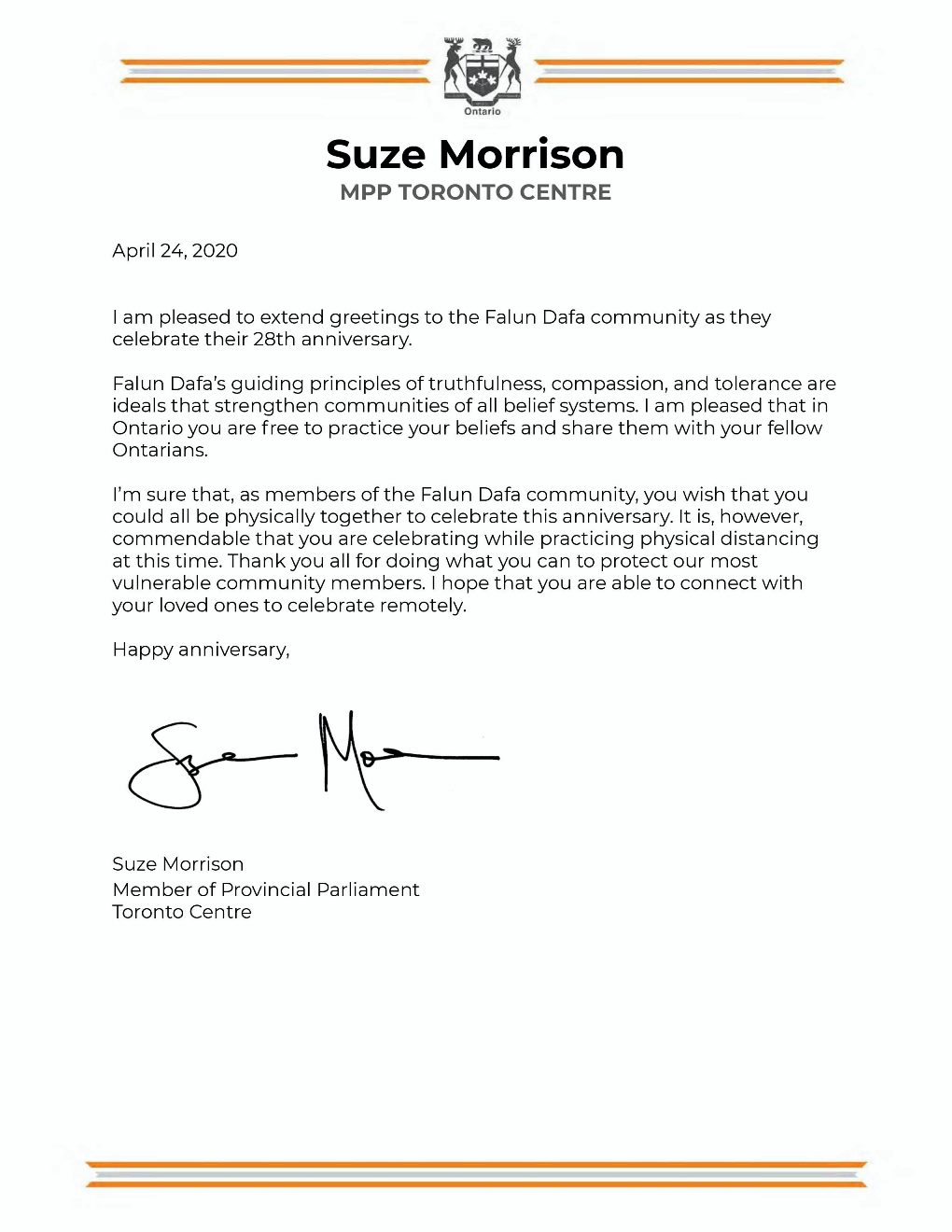 多伦多中心省议员苏兹·莫里森 (Suze Morrison )给大法协会的贺信中说,我很高兴向法轮大法社区致以问候,庆祝法轮大法传世28周年。法轮大法真善忍的修炼指导原则对任何社区都有助益。我很高兴在安大略省,你们拥有信仰自由,并可以与安省民众分享你们的功法和信仰。我相信,作为法轮大法社区的成员,你们一定希望可以欢聚一堂,庆祝这个周年纪念日。但是,值得称赞的是,你们能够保持社交距离来庆祝佳节。谢谢大家为保护我们的社区成员的珍贵生命所做的一切 。虽然不能面对面,我愿你们和心爱的人们一起欢庆,周年快乐。