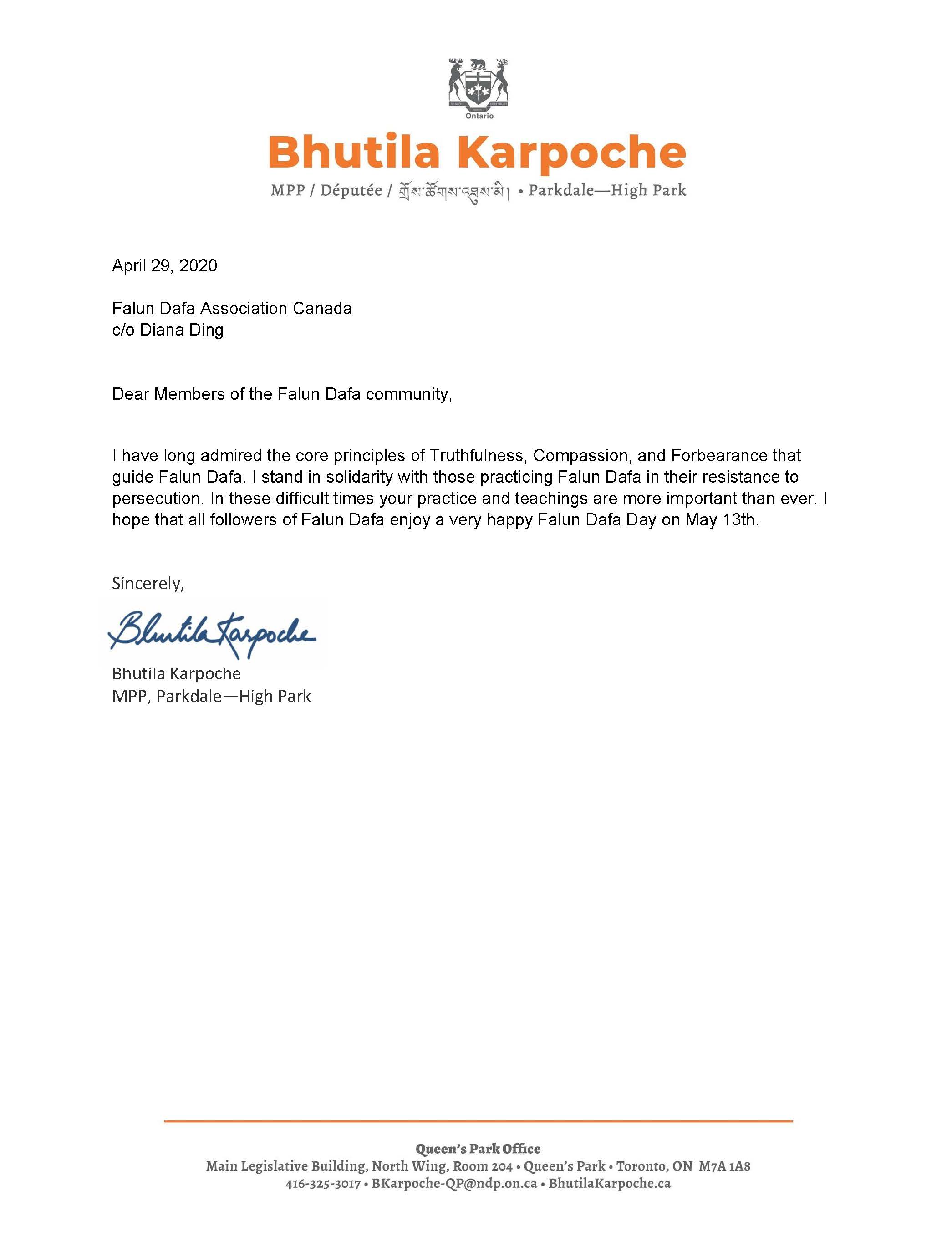 省议员普芝·嘎波且(Bhutila Karpoche)致信给加拿大法轮大法协会: