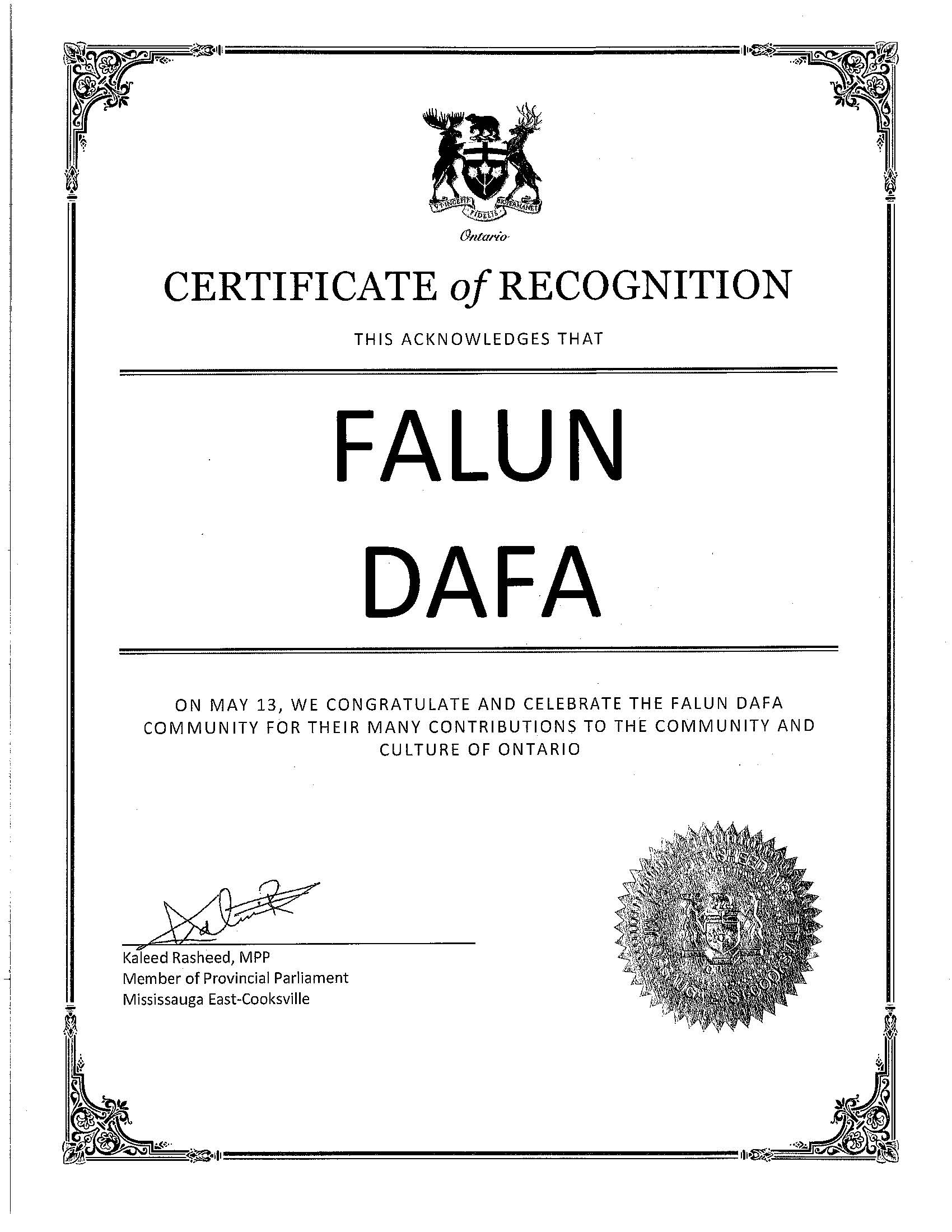 安省省议员凯里·拉希德(Kaleed Rasheed)给法轮大法协会颁发嘉奖令: