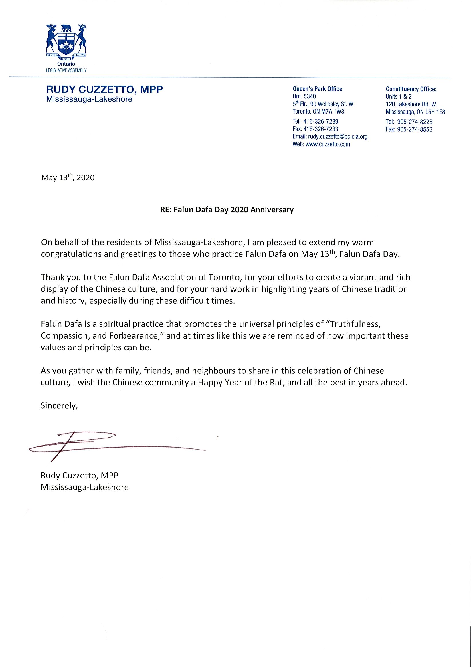 省议员鲁迪·库泽托(Rudy Cuzzetto)致贺信2020年法轮大法纪念日说:我代表Mississauga-Lakeshore 选区的居民,非常荣幸地向5.13法轮大法日送上最诚挚的祝贺与问候。感谢多伦多法轮大法协会, 感谢你们为彰显中国传统和历史文化所作出的不懈努力, 尤其在这个疫情肆虐的艰难时期。