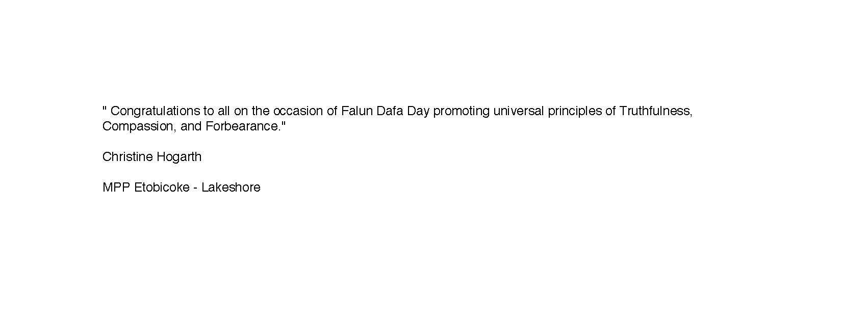 安省怡陶碧谷-湖滨区(Etobicoke – Lakeshore)省议员克里斯汀·侯嘉思(Christine Hogarth)发邮件恭贺法轮大法日:“值此法轮大法日之际,恭贺诸位继续推广‘真、善、忍’的普世理念。”
