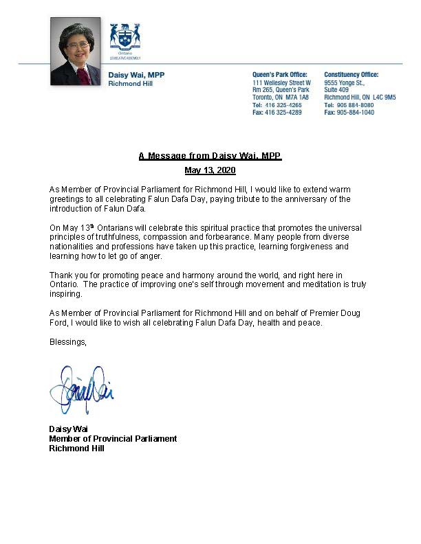 安省列治文山(Richmond Hill)华裔省议员韦邱佩芳(Daisy Wai)的贺信写道:“作为列治文山(Richmond Hill)选区的省议员,我向参与法轮大法日周年庆典活动的所有朋友致以由衷的问候。在5月13日,安大略人将庆祝传播真善忍普世价值的功法面世28周年。许许多多来自不同族裔的各界人士走进了法轮大法,学习如何宽恕他人,如何化解易怒情绪。”“感谢你们为促进安大略省以及世界各地的和平与和谐所作出的努力。通过练功和冥想打坐提升自我的方式真是启迪人心。作为列治文山的省议会议员,我代表道格福特省长,祝大家法轮大法日安康、快乐!”