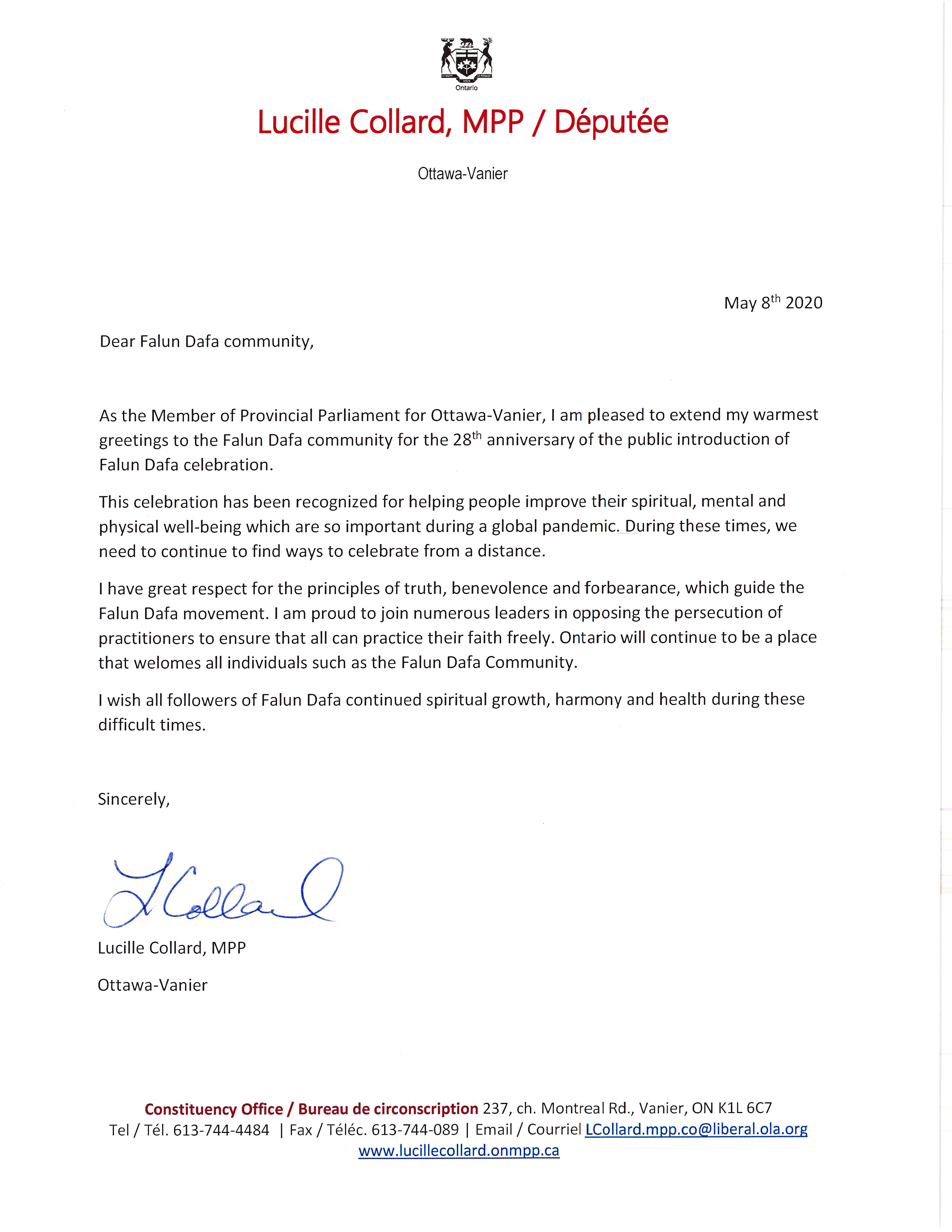 安省省议员露西尔·科拉德(Lucille Collard)在贺信中写道:“作为Ottawa-Vanier选区的省议会议员,我高兴向法轮大法修炼者致以最亲切的问候,以庆祝法轮大法弘传第二十八年。”“这个庆祝不仅能帮助人们改善精神,心理和身体健康,这也是在现在这场全球疫情中至关重要的。”