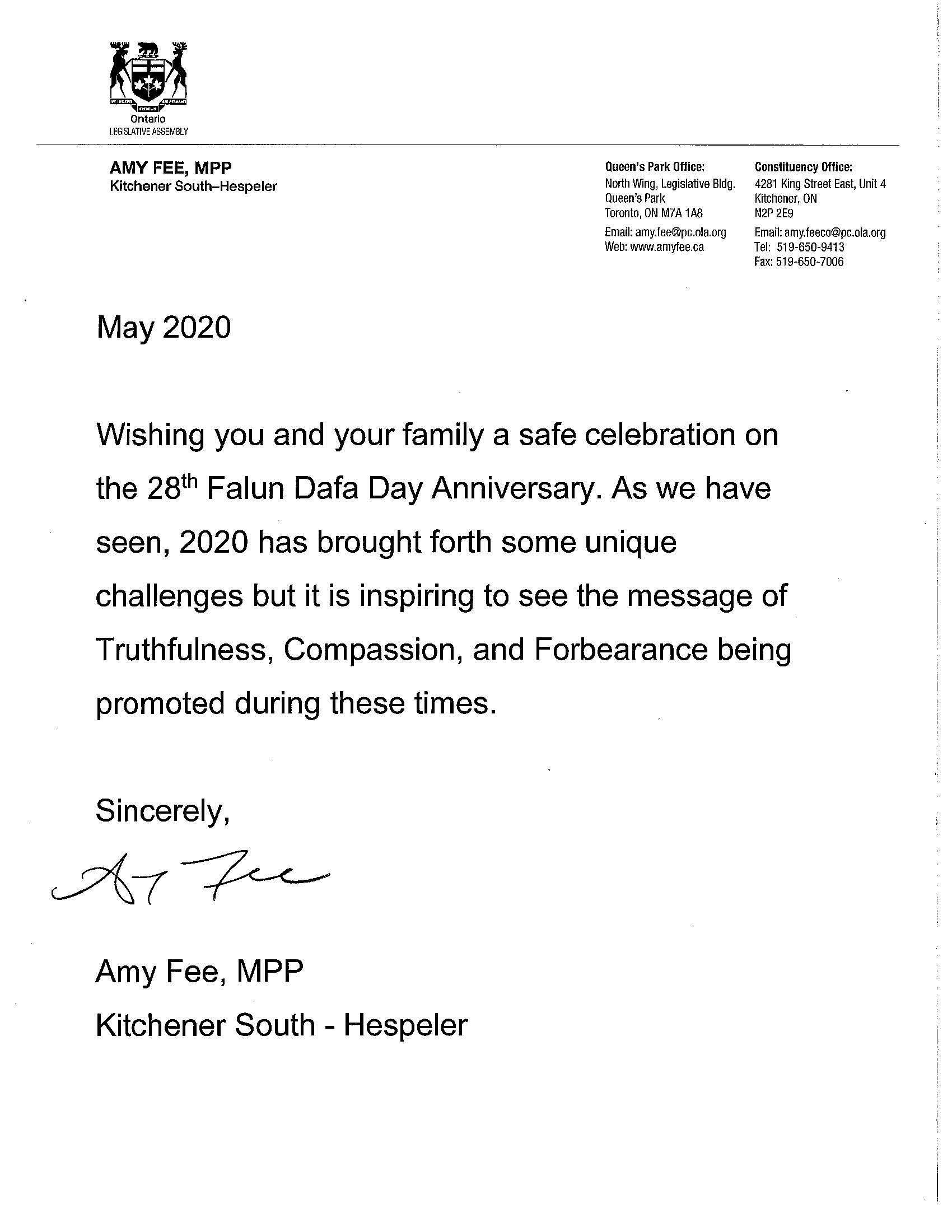 安省省议员艾米·费(Amy Fee)发来贺信,恭祝法轮大法传世二十八周年。