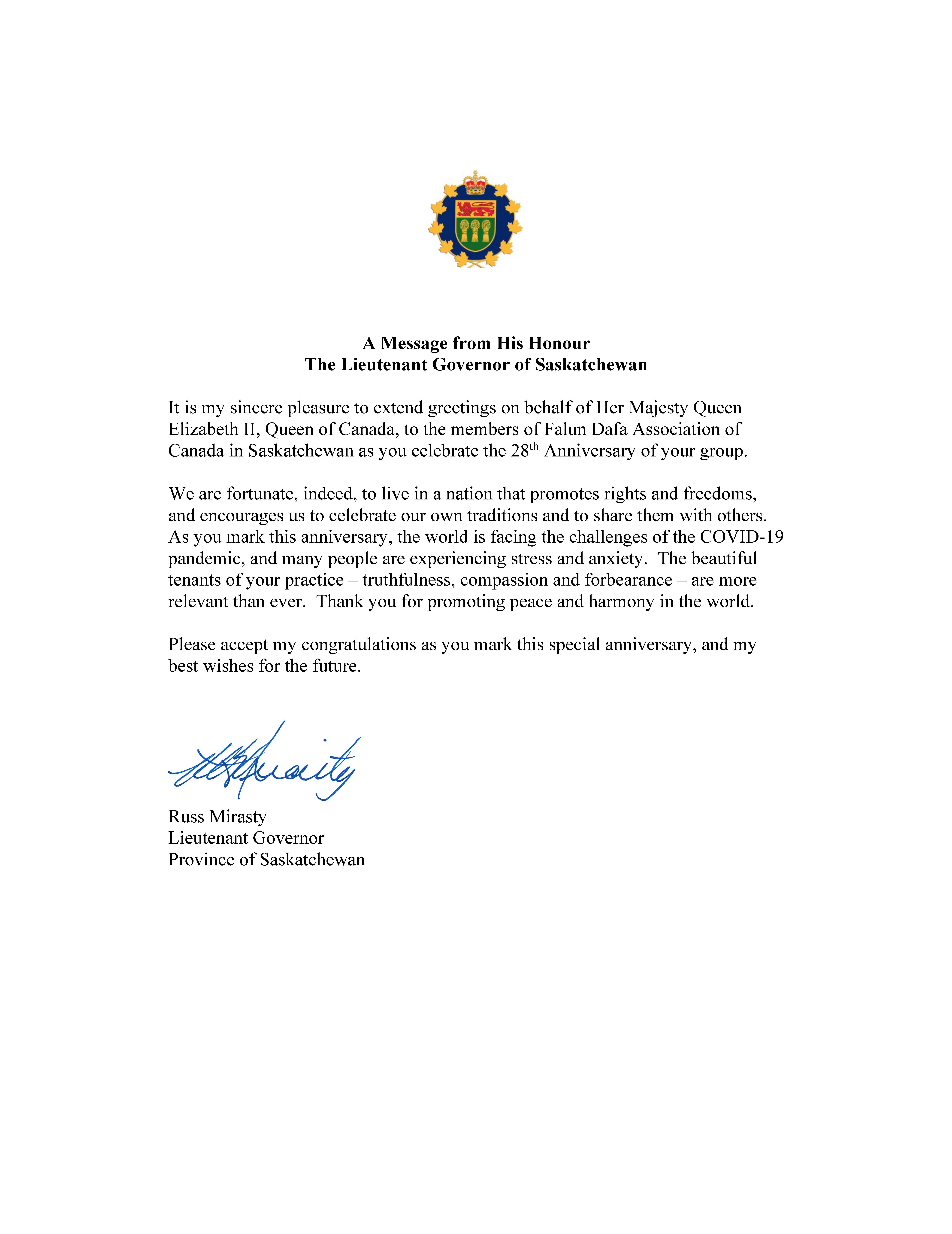 萨斯喀彻温省省督罗素·莫瑞斯蒂(Russell Mirasty)来贺信写道:“在中共病毒肆虐加拿大之时,很多人都感到紧张和不安,(法轮大法)的美好理念‘真、善、忍’,比以往任何时候都(与我们)更加息息相关。谢谢你们在全世界推广平和。”