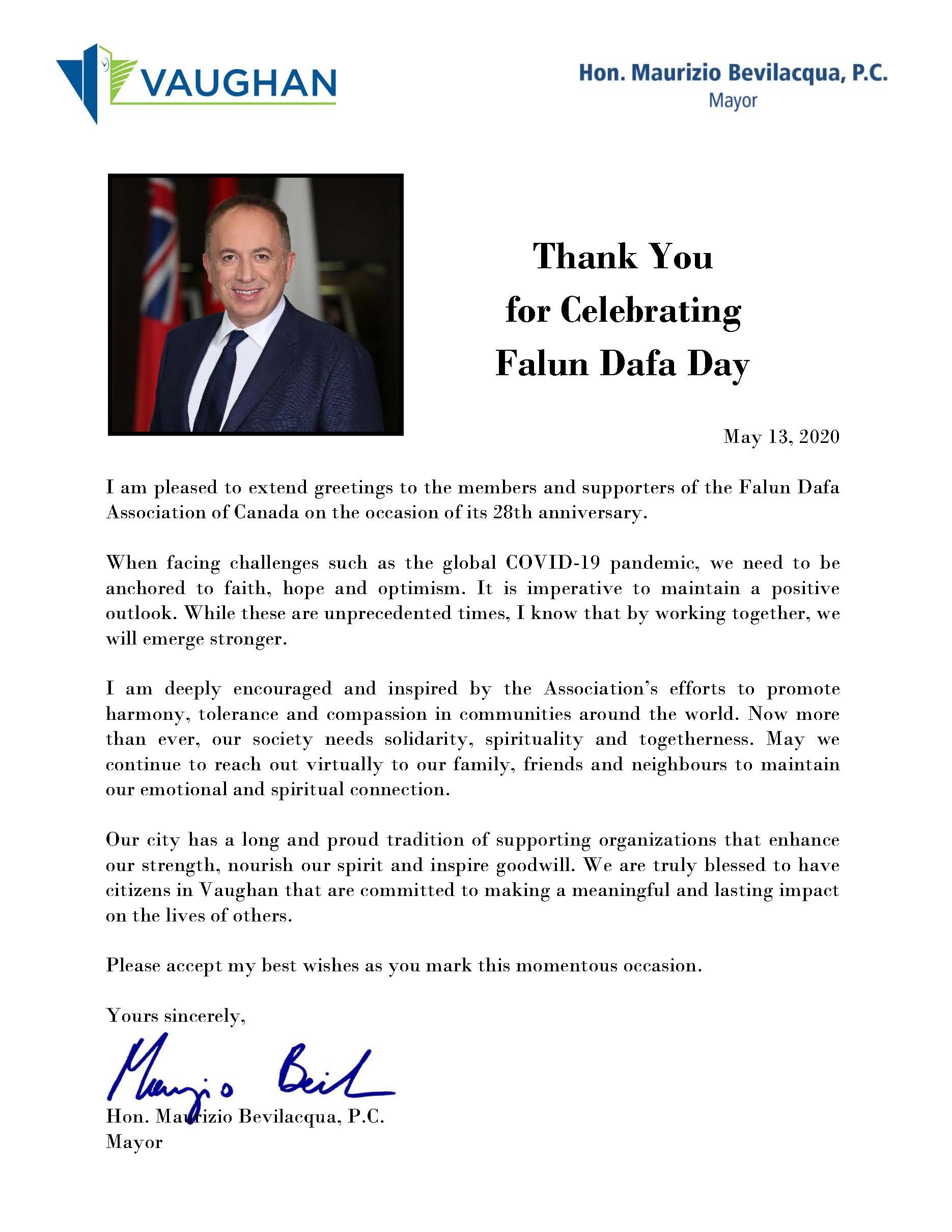 大多伦多地区旺市(Vaughan)市长毛里齐奥·贝维拉夸(Maurizio Bevilacqua)的贺信表示,非常高兴能在法轮大法弘传二十八周年之际,向加拿大法轮大法学会的成员们的支持者表达我的问候。
