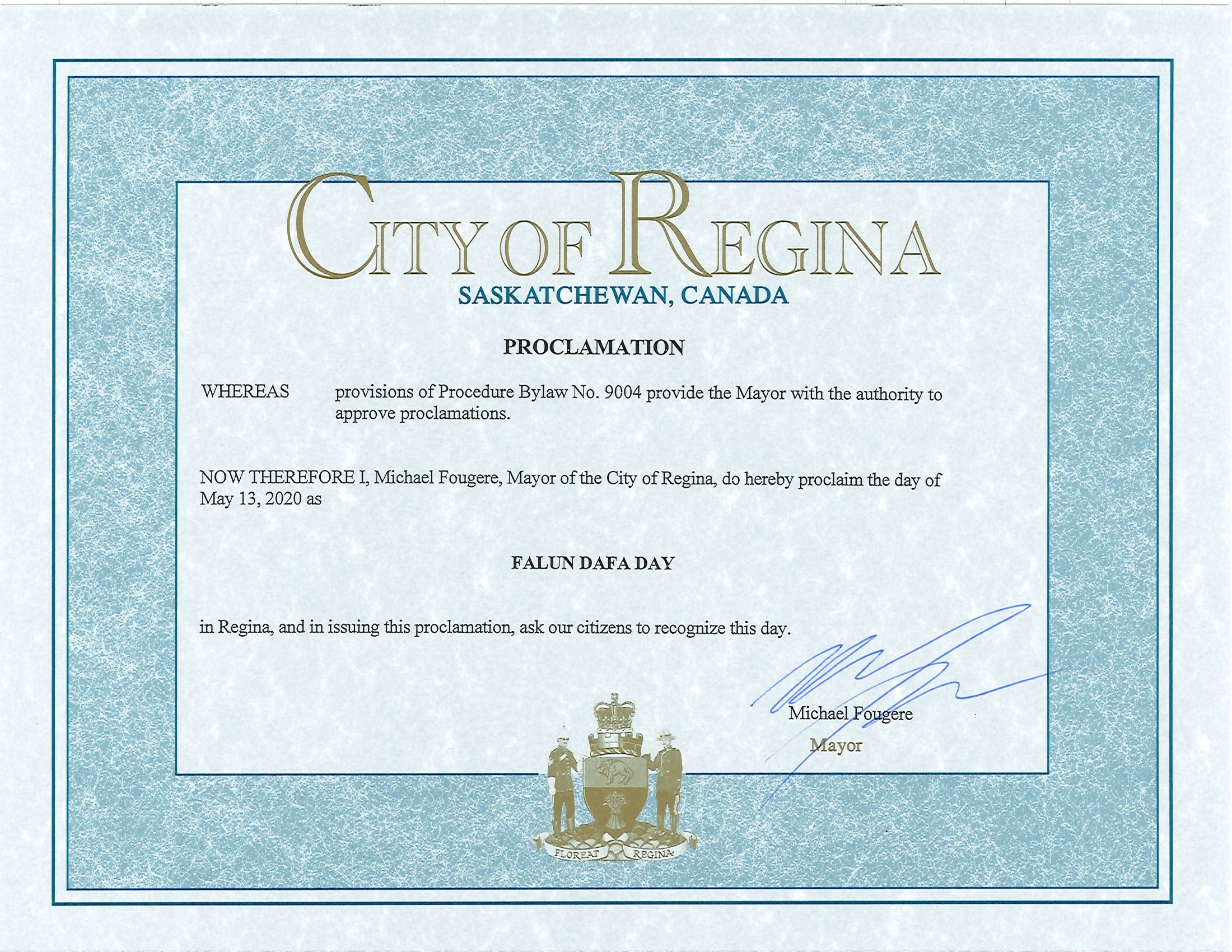 里贾纳(Regina)市长迈克尔·福格勒(Michael Fougere)宣布褒奖法轮大法,并宣布二零二零年五月十三日为里贾纳市“法轮大法日”。