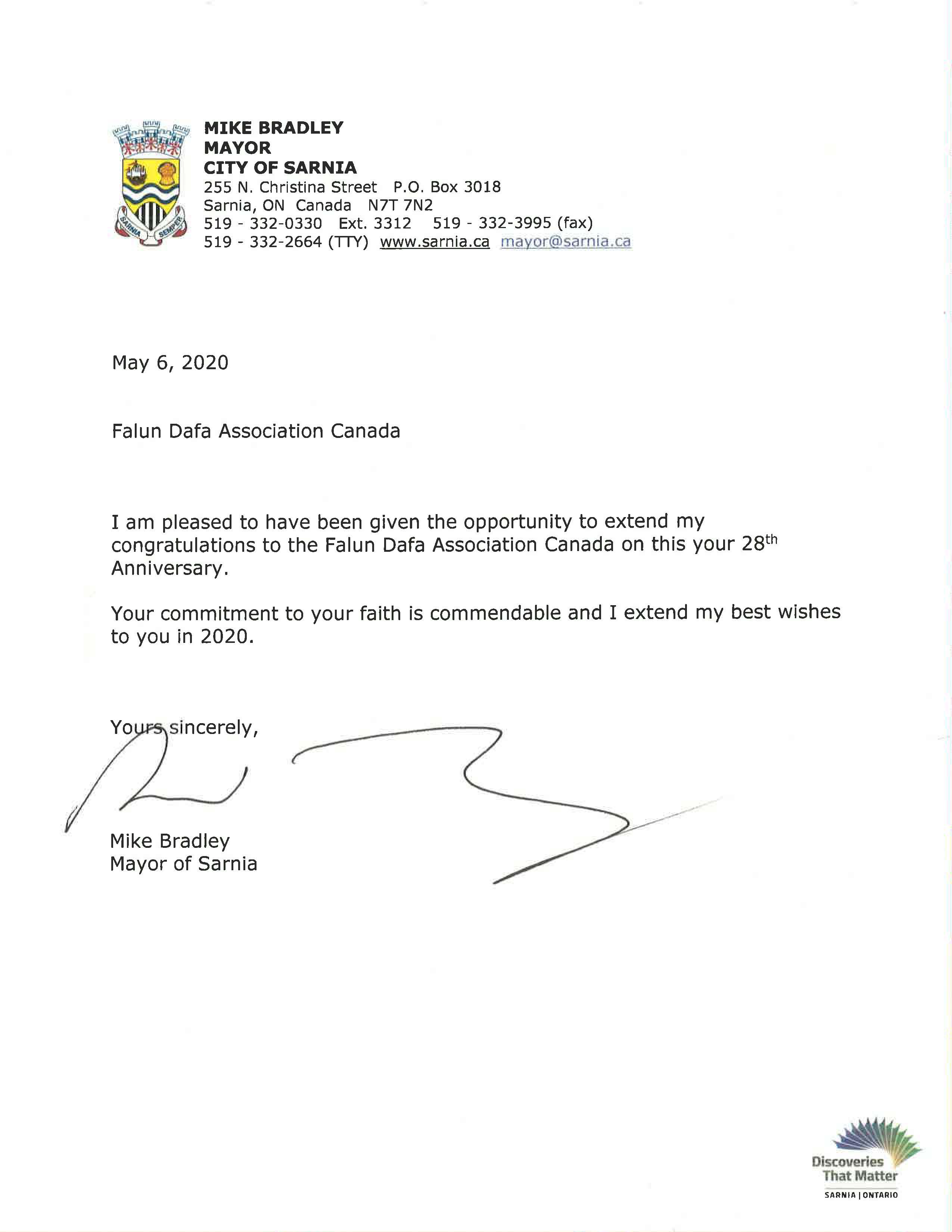 安省萨尼亚市(Sarnia)市长迈克·布拉德利(Mike Bradley)在贺信中写道:“在法轮大法协会庆贺法轮大法传世28周年庆典之际,我非常荣幸能借此良机表达我衷心的祝贺。您们对信仰的坚守值得称赞。祝您们在2020 年万事如意!”
