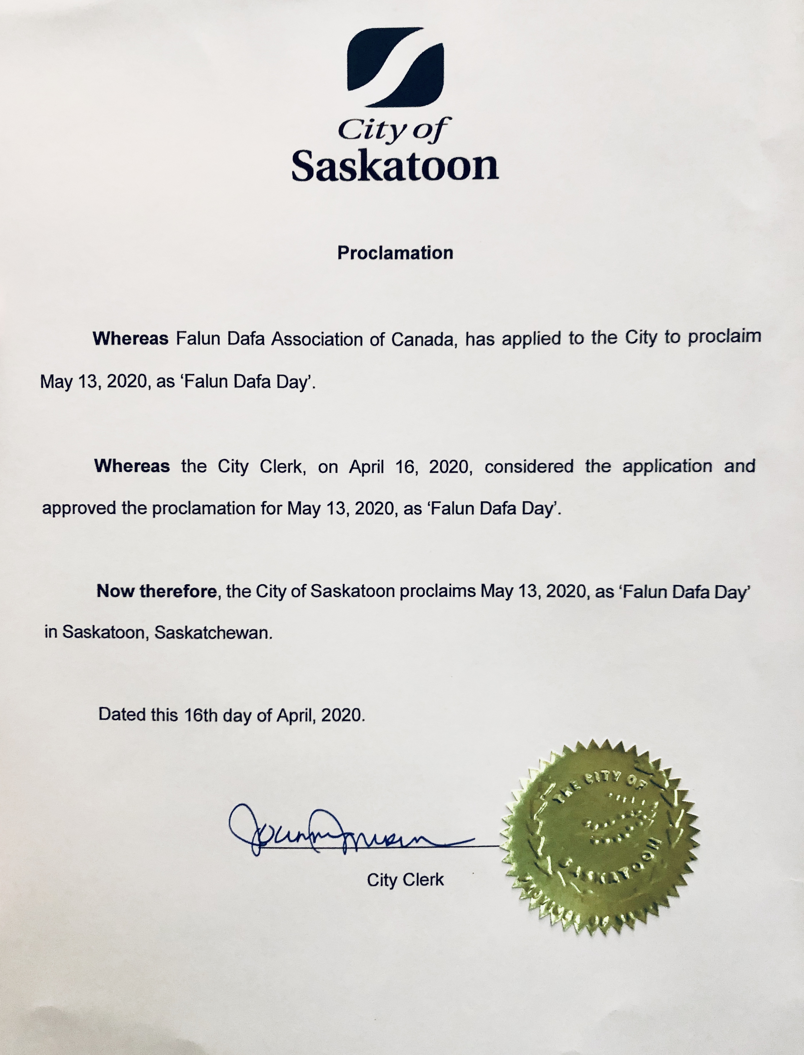 萨斯喀彻温省最大城市萨斯卡通市(Saskatoon)宣布二零二零年五月十三日为萨斯卡通市“法轮大法日”。