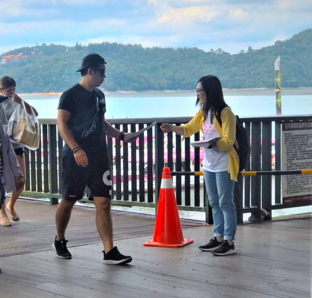 来自云林的金绵介绍了她在日月潭遇到的有缘人,她说:有位女士去美国旅游,看到美国的景点也有许多法轮功学员讲真相,了解到大法在世界各地都有,于是好奇地在展板前看了很久,提出很多问题,学员一一解答她的疑惑后,她对大法相当认同与支持。