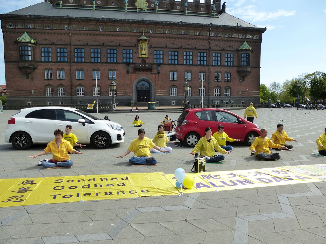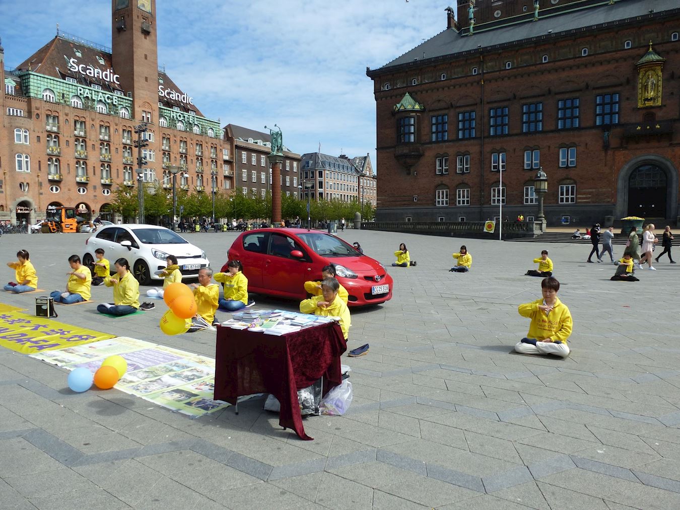 五月九日下午,丹麦部份法轮功学员在哥本哈根市政厅广场,铺开各种大法横幅与图片,吹起印有“法轮大法好!”字样的气球,摆放好各种语言的介绍法轮大法的资料,在炼功音乐的引导下,静静地向人们演示功法,庆祝世界法轮大法日。