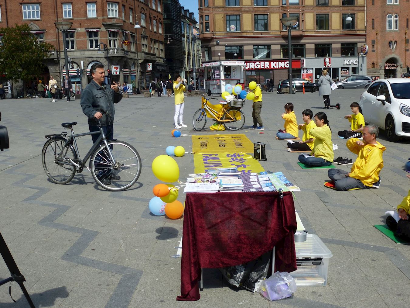 这个丹麦首都市中心往常最热闹的广场,由于疫情的影响,今天过往的人明显减少。但法轮功学员的功法演示仍然吸引了不少路人。当音乐一开始响起时,就有一位骑自行车路过的人竖起了大拇指,大声喝彩叫好。一些带着孩子的行人,欣喜地接受学员们热情递上的彩色气球,和摆在资料桌上的水晶莲花,以及其它有关介绍资料。