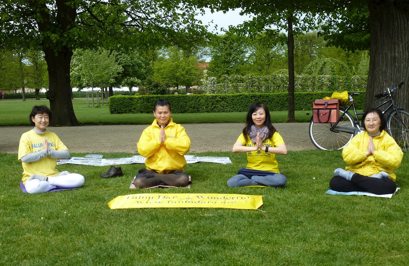同日清晨,部份法轮功学员来到位于市区的国王公园静静地炼着五套法轮功功法,并在炼功结束后,双手合十,表达对师尊的感谢。这是丹麦学员从一九九七年以来坚持至今的集体炼功点。初夏的北欧,阳光明媚,万物复苏,花草树木郁郁葱葱,翠绿的公园生机勃勃。