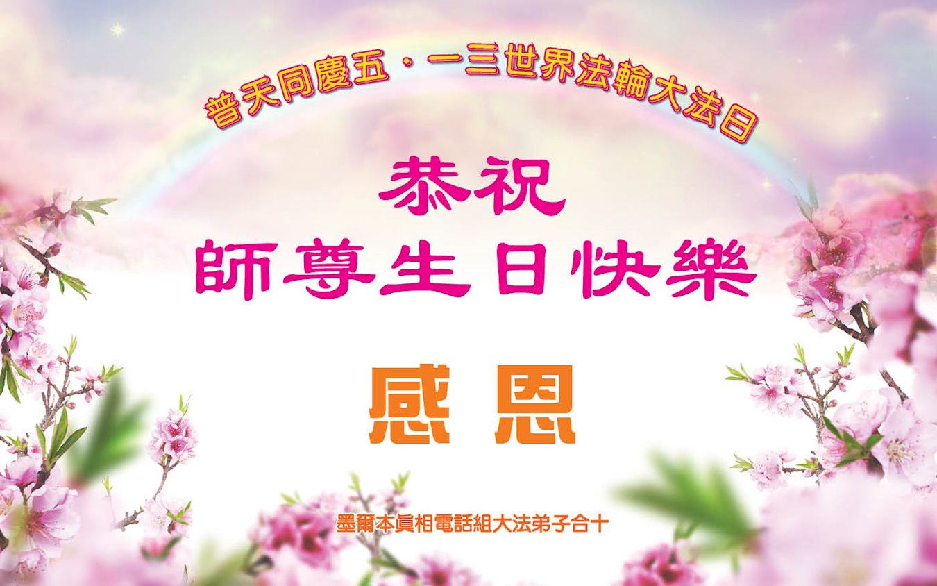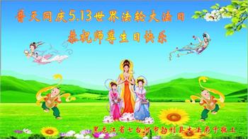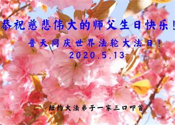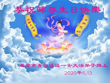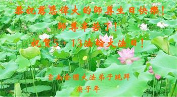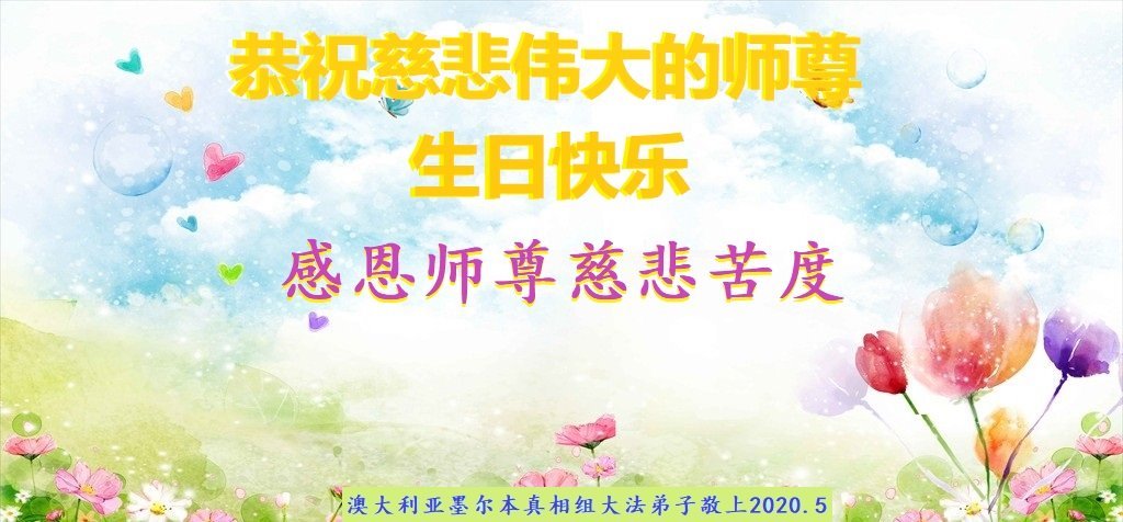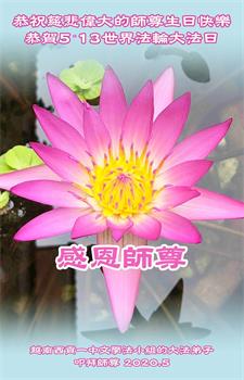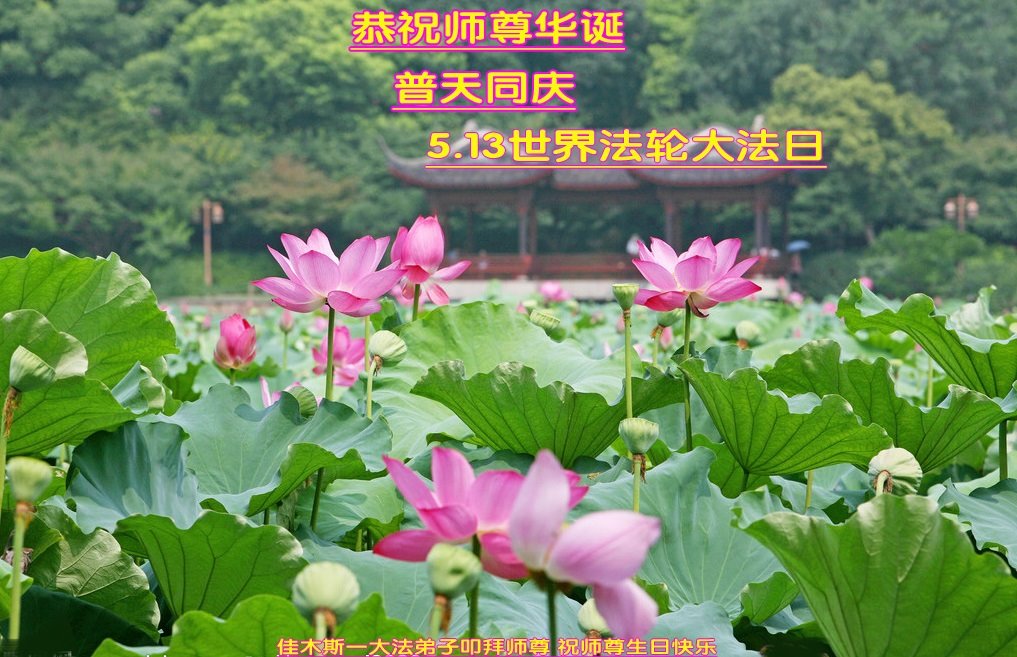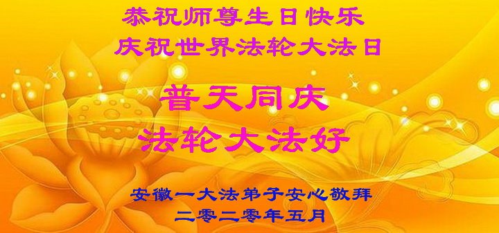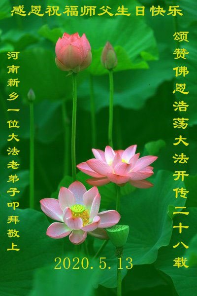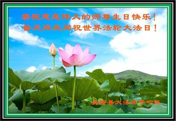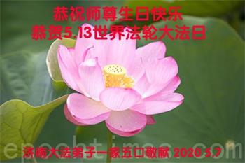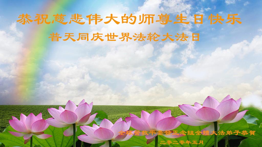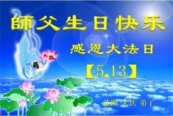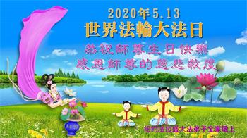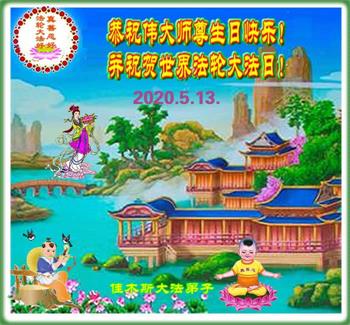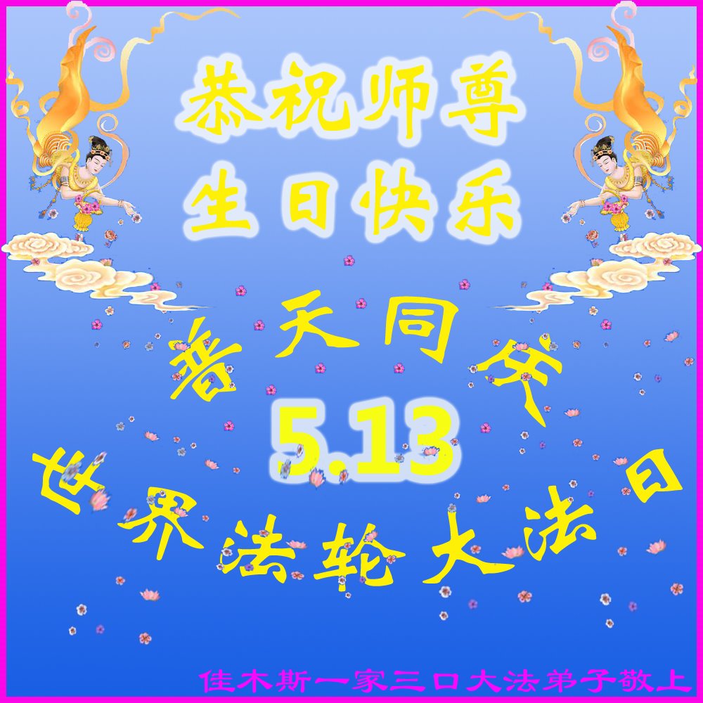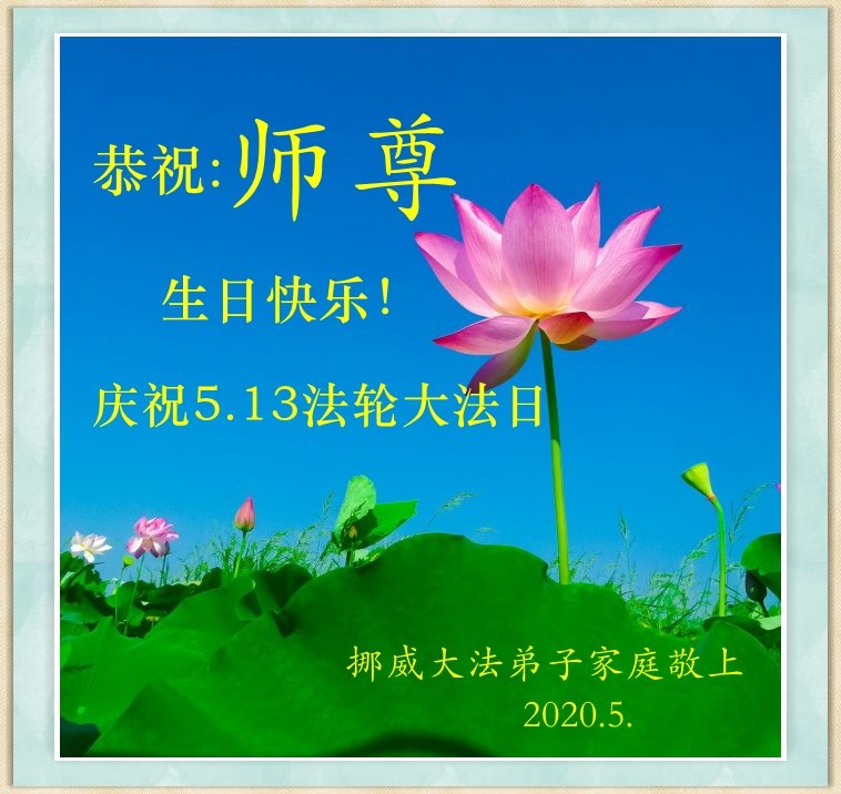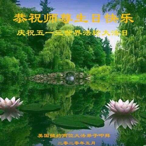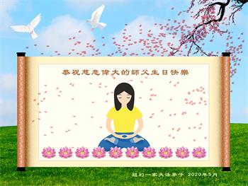 在2020年“5.13”世界法轮大法日这个殊胜的日子,我由衷地感恩师尊!感恩师尊给了我第二次生命,感恩师尊给了千千万万人第二次生命!师父说:“我洪传即是普度”(《精進要旨》〈拜师〉)。但是谁又能体会到这句话的真正涵义?普度背后的承受;普度背后的付出;普度背后的无量慈悲,都无法用人类的语言去描述。感恩师尊传出这么美好的大法,给了十恶毒世中的世人一次走向希望和光明的机会!再一次恭祝师尊生日快乐!