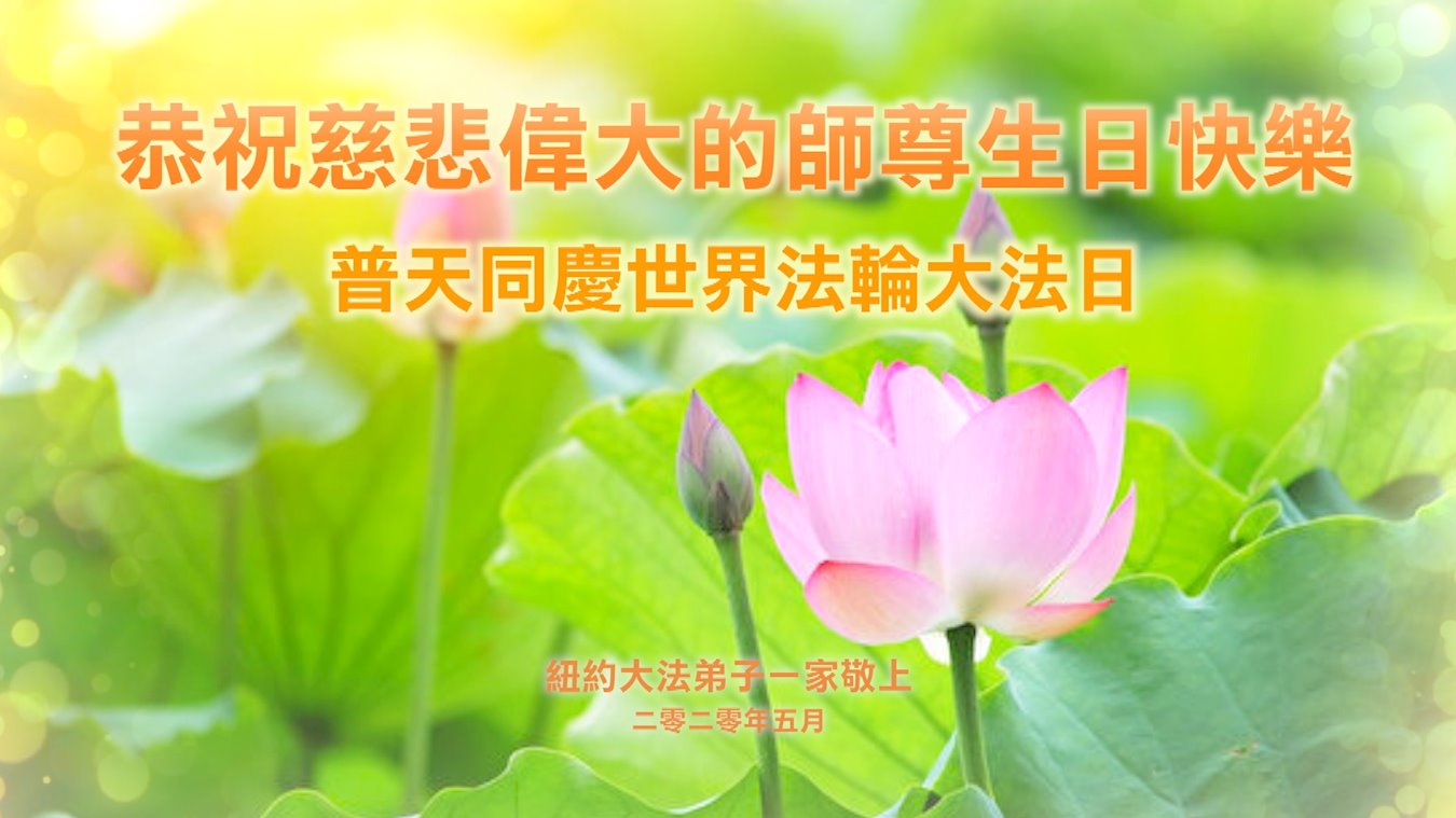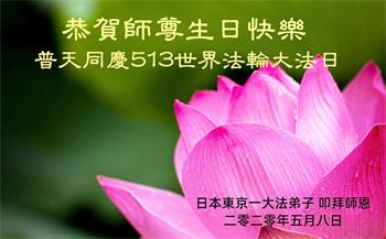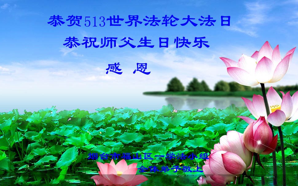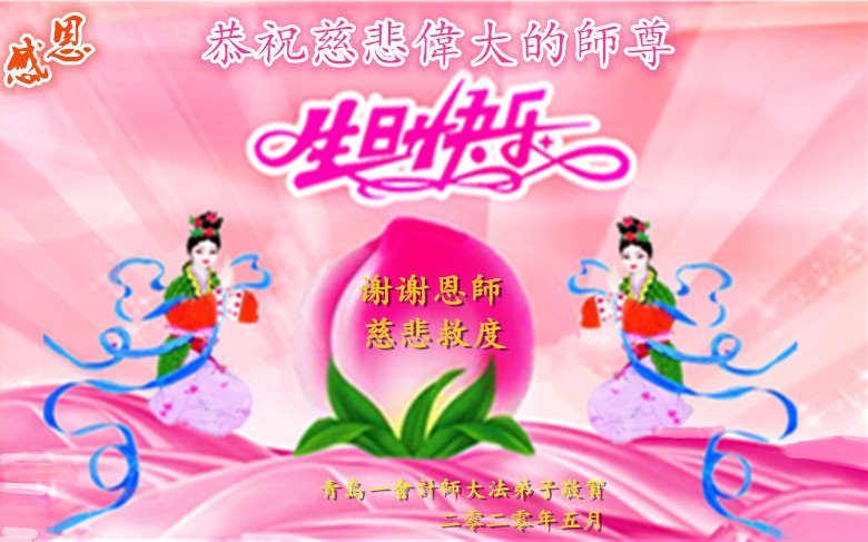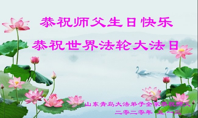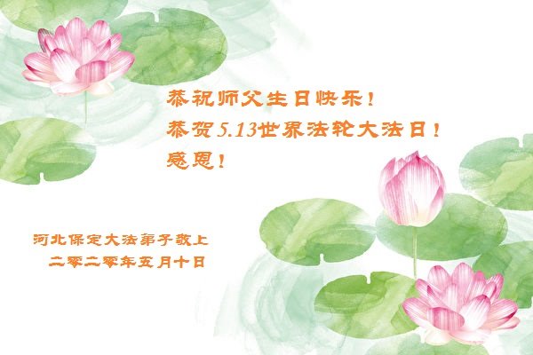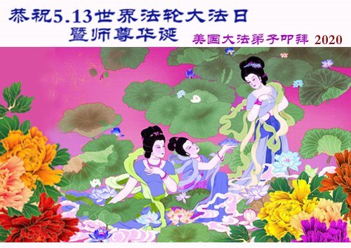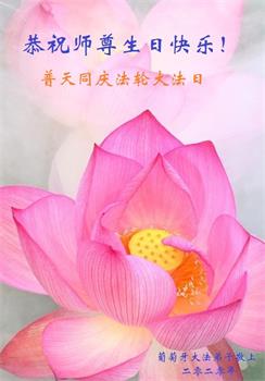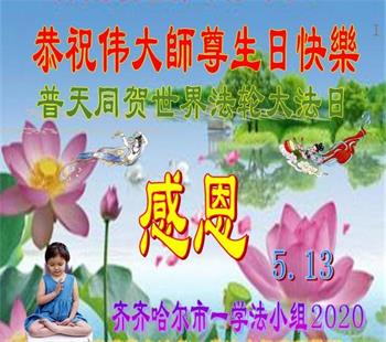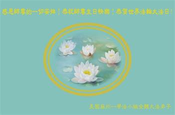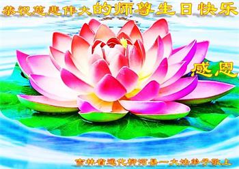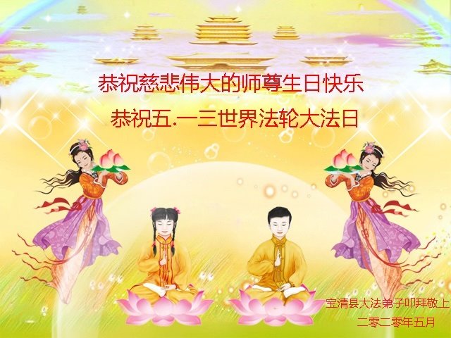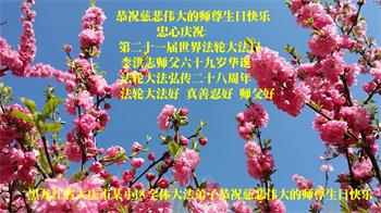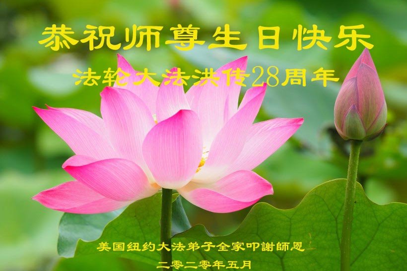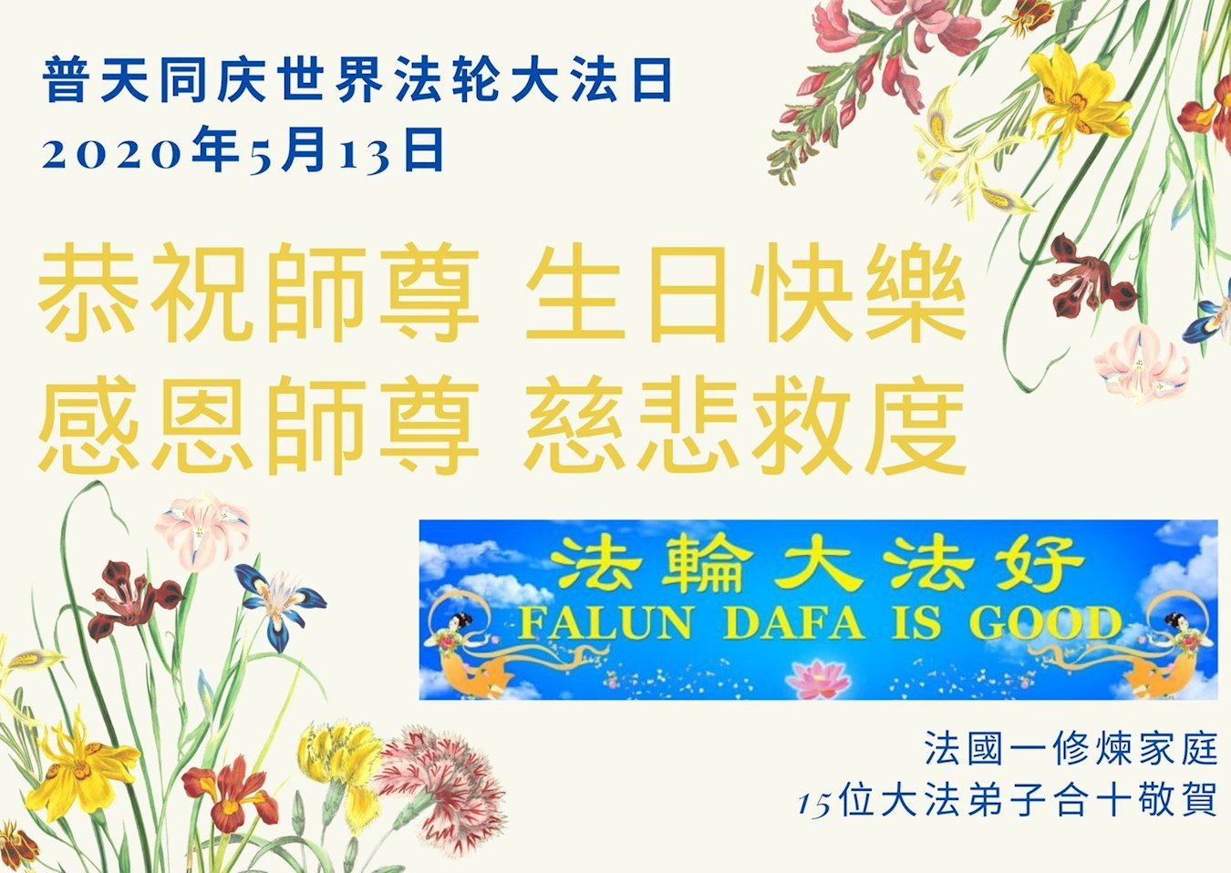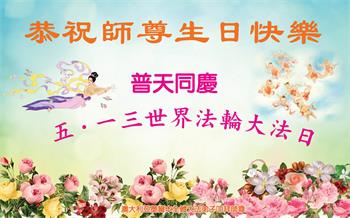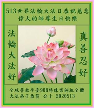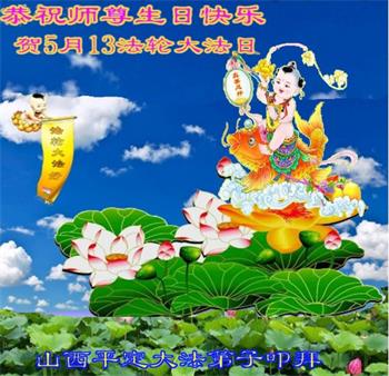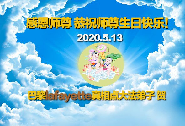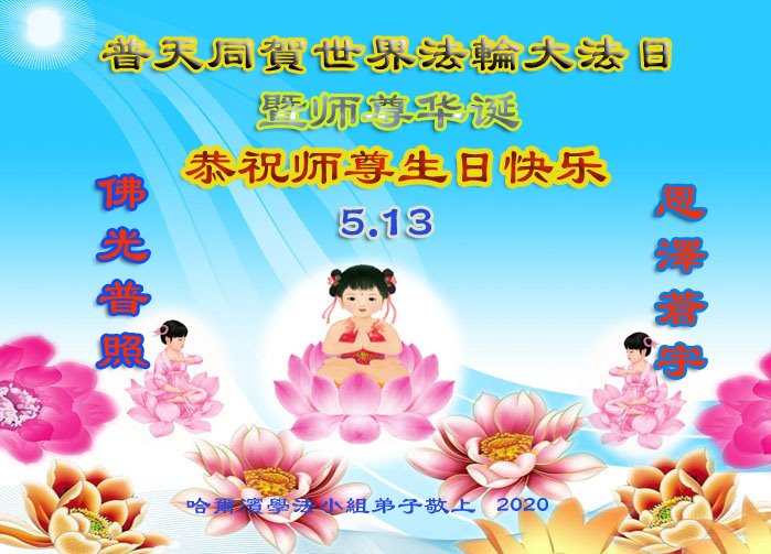 在2020年“5.13”世界法轮大法日这个殊胜的日子,我由衷地感恩师尊!感恩师尊给了我第二次生命,感恩师尊给了千千万万人第二次生命!师父说:“我洪传即是普度”(《精進要旨》〈拜师〉)。但是谁又能体会到这句话的真正涵义?普度背后的承受;普度背后的付出;普度背后的无量慈悲,都无法用人类的语言去描述。感恩师尊传出这么美好的大法,给了十恶毒世中的世人一次走向希望和光明的机会!再一次恭祝师尊生日快乐!