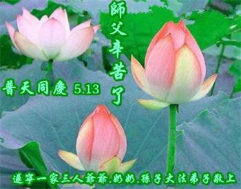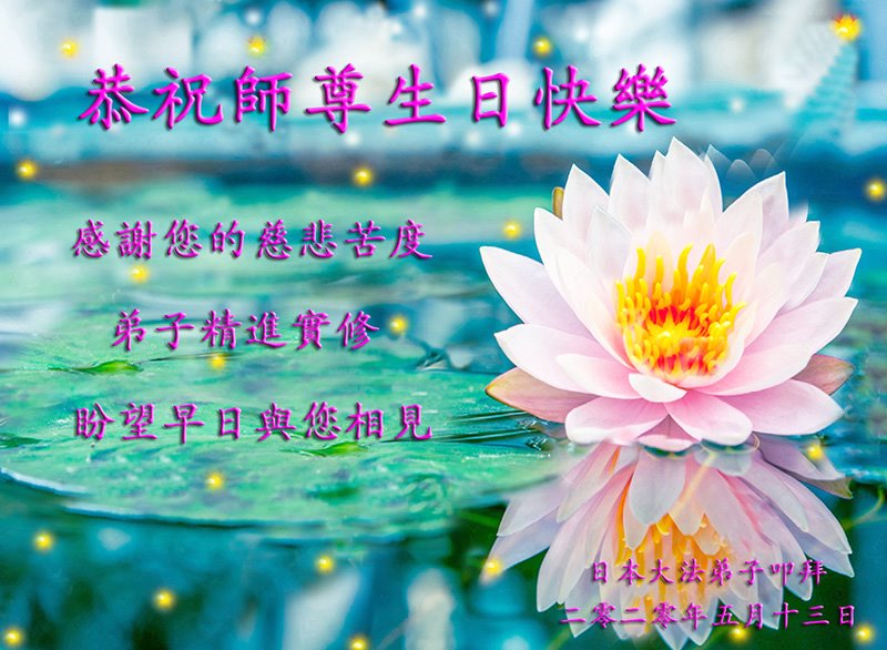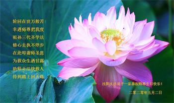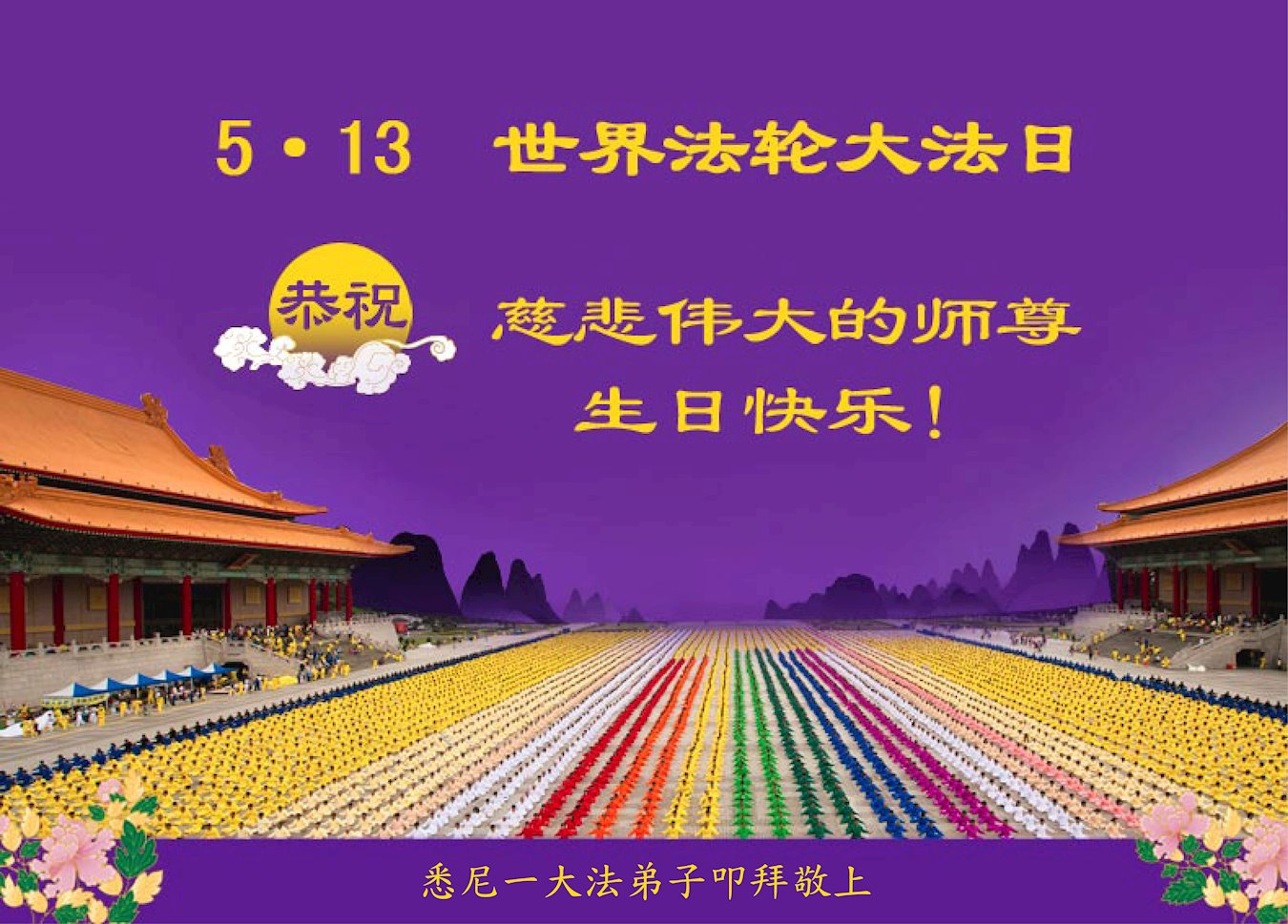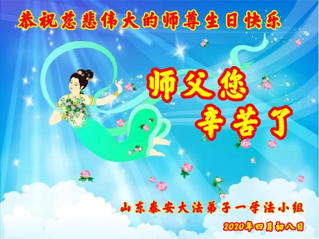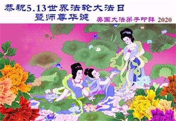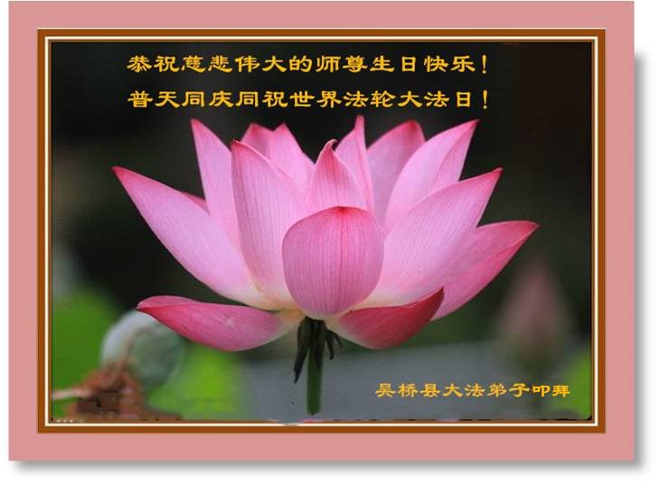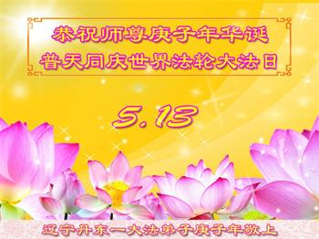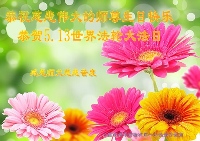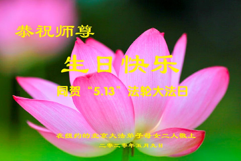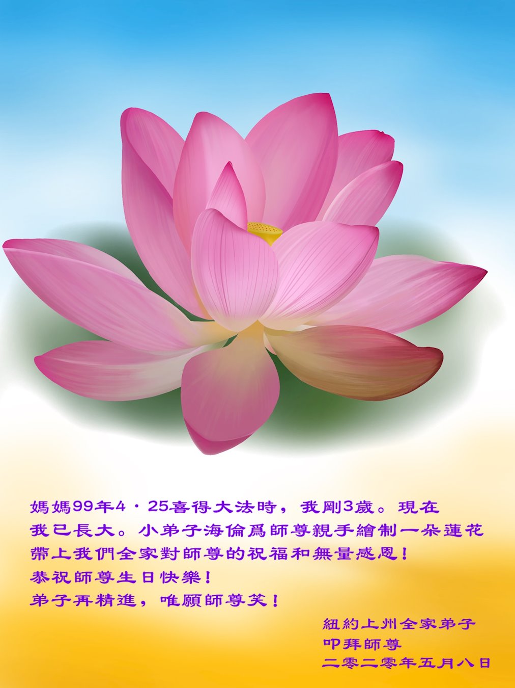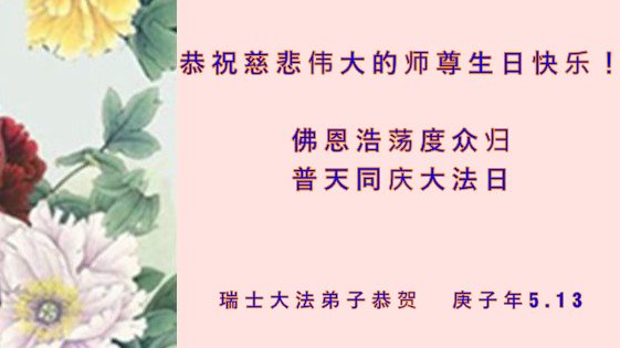 在2020年“5.13”世界法轮大法日这个殊胜的日子,我由衷地感恩师尊!感恩师尊给了我第二次生命,感恩师尊给了千千万万人第二次生命!师父说:“我洪传即是普度”(《精進要旨》〈拜师〉)。但是谁又能体会到这句话的真正涵义?普度背后的承受;普度背后的付出;普度背后的无量慈悲,都无法用人类的语言去描述。感恩师尊传出这么美好的大法,给了十恶毒世中的世人一次走向希望和光明的机会!再一次恭祝师尊生日快乐!