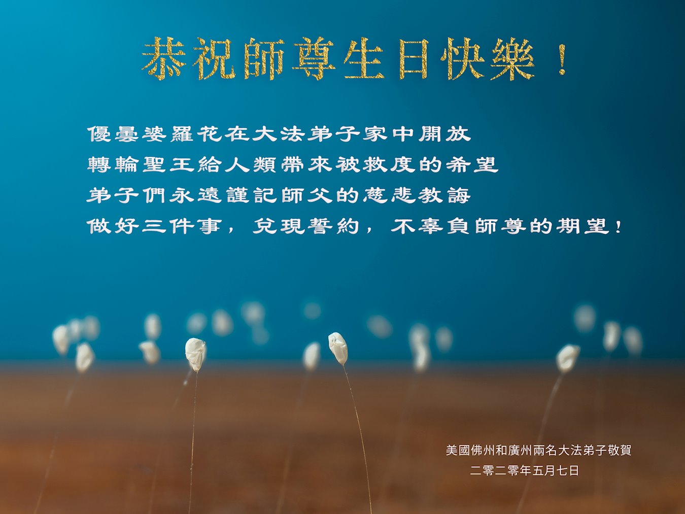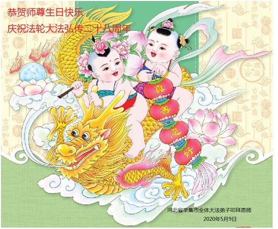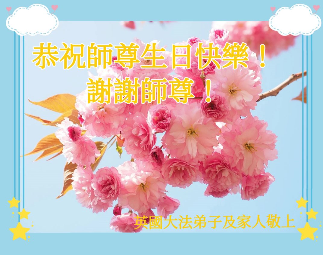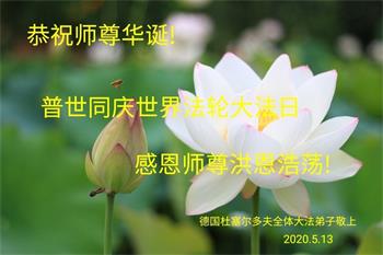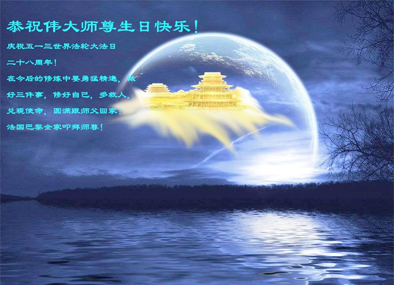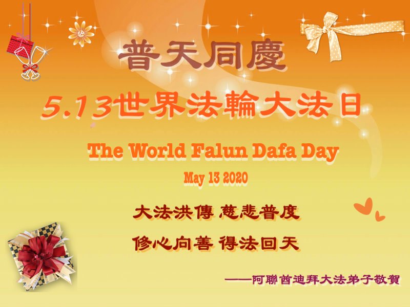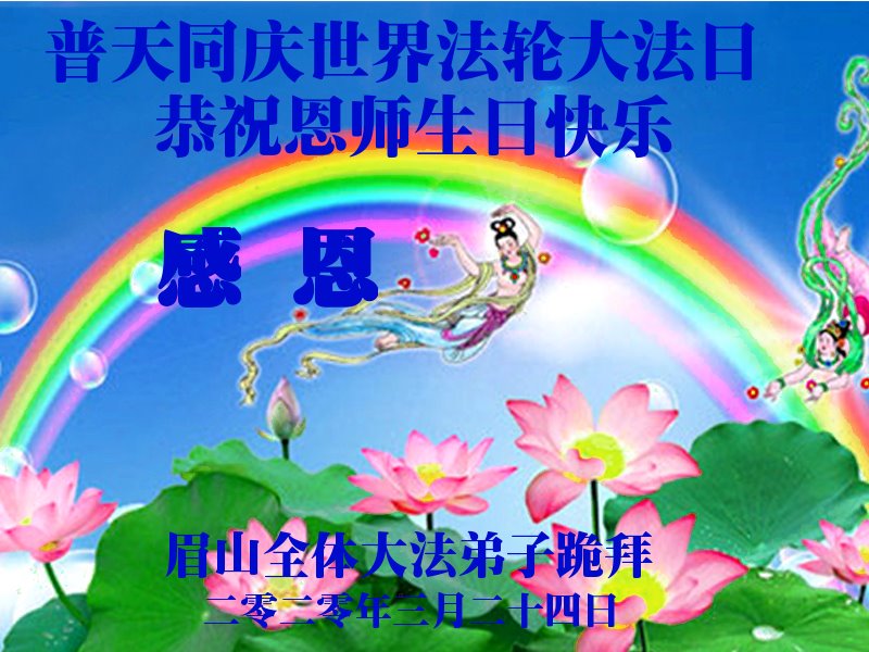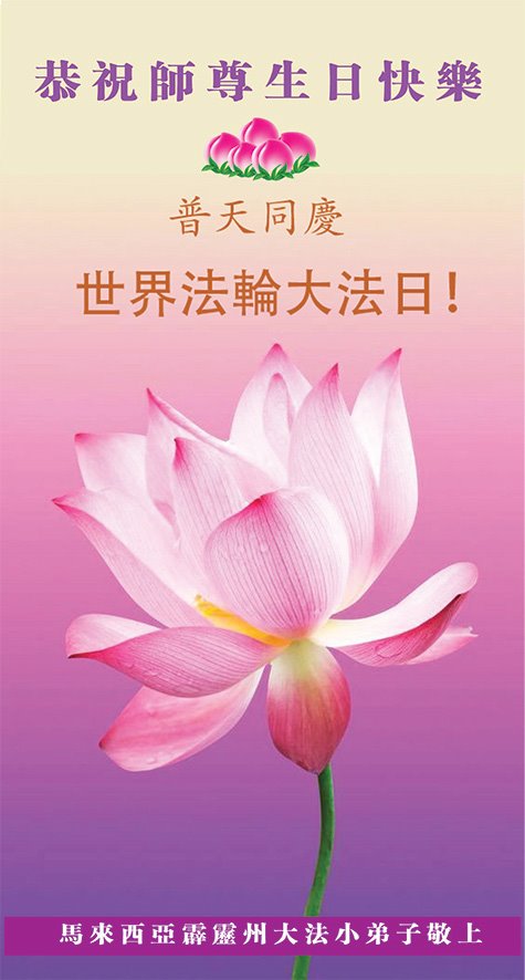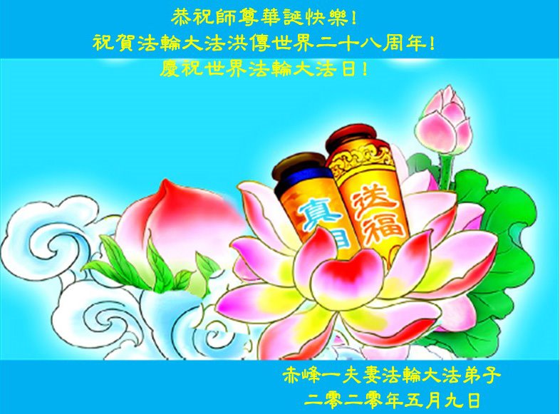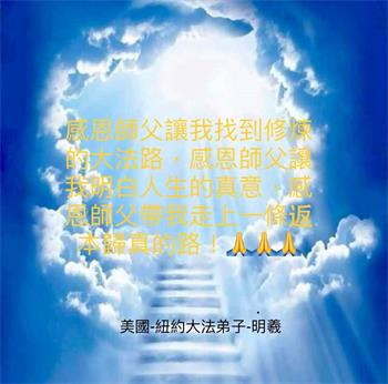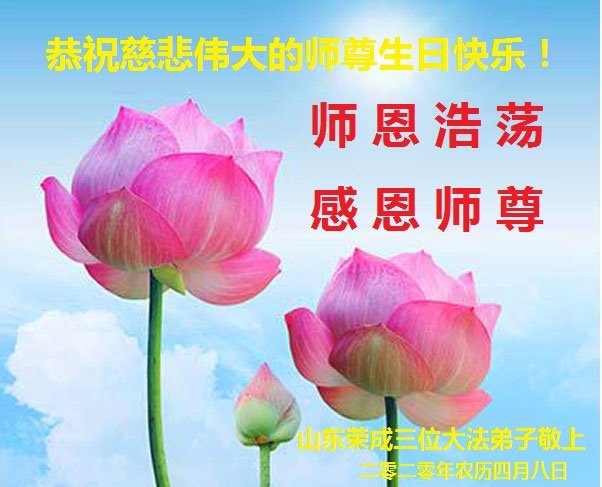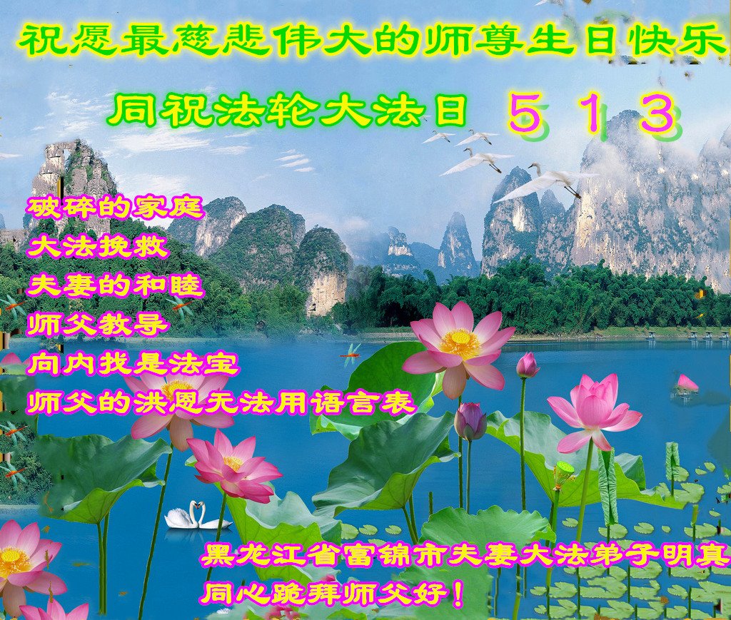 在2020年“5.13”世界法轮大法日这个殊胜的日子,我由衷地感恩师尊!感恩师尊给了我第二次生命,感恩师尊给了千千万万人第二次生命!师父说:“我洪传即是普度”(《精進要旨》〈拜师〉)。但是谁又能体会到这句话的真正涵义?普度背后的承受;普度背后的付出;普度背后的无量慈悲,都无法用人类的语言去描述。感恩师尊传出这么美好的大法,给了十恶毒世中的世人一次走向希望和光明的机会!再一次恭祝师尊生日快乐!