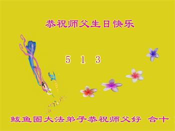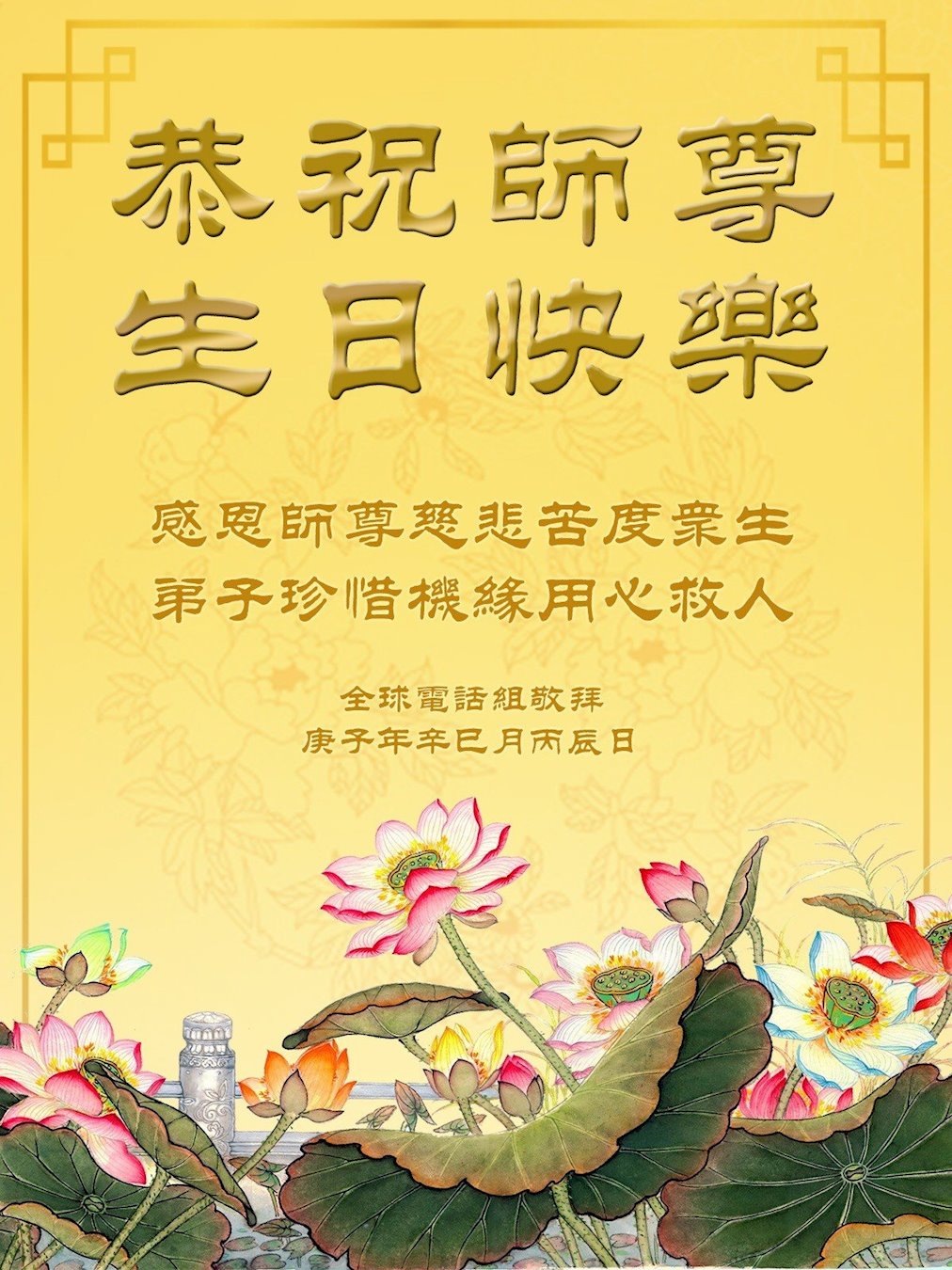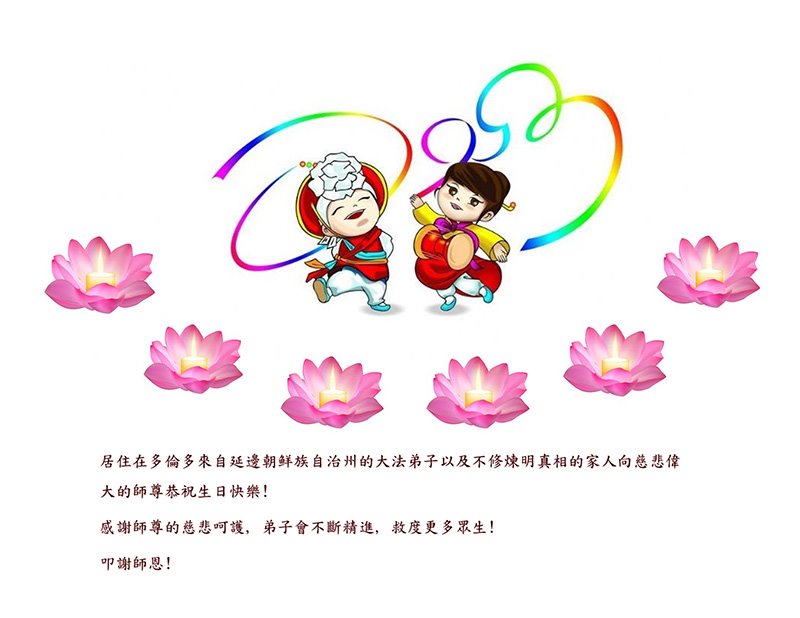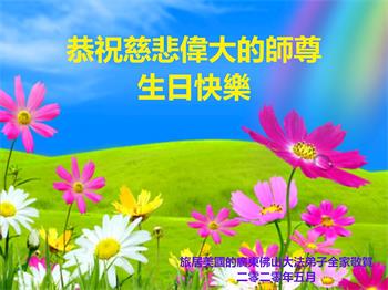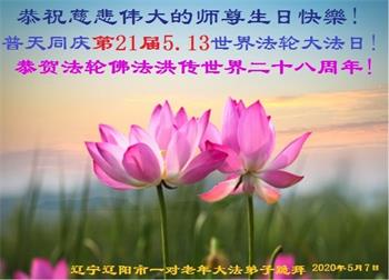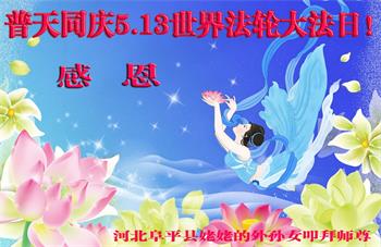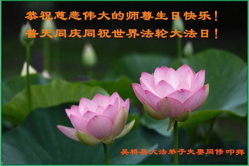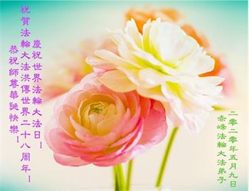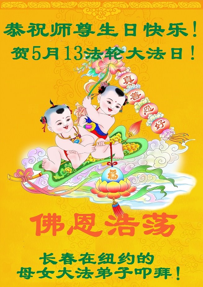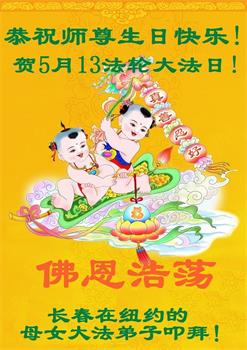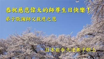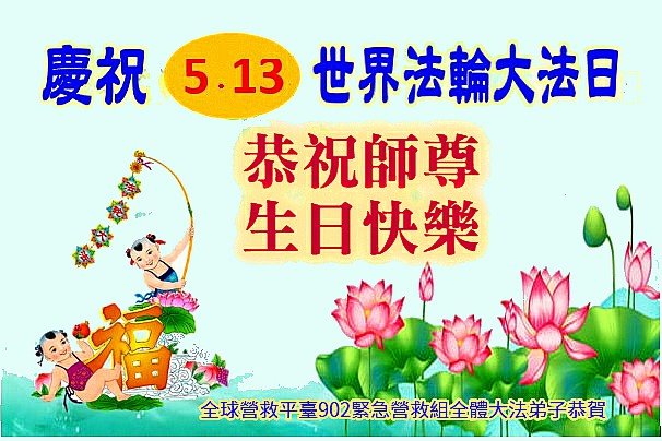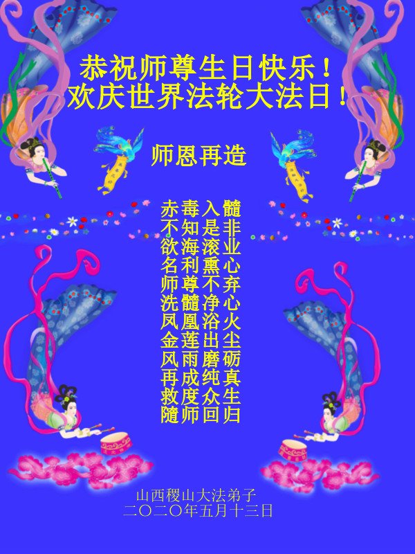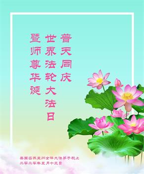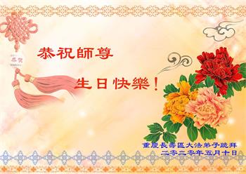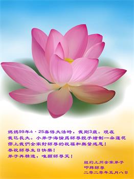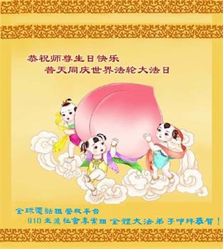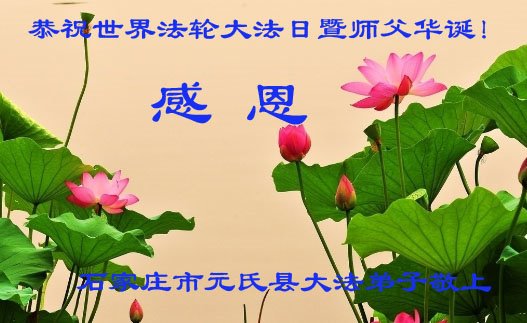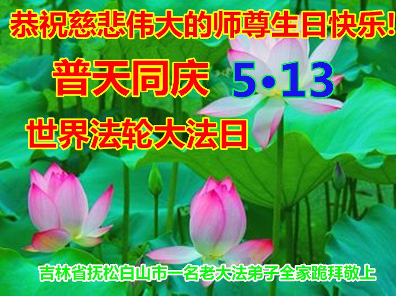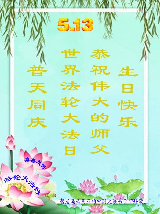 在2020年“5.13”世界法轮大法日这个殊胜的日子,我由衷地感恩师尊!感恩师尊给了我第二次生命,感恩师尊给了千千万万人第二次生命!师父说:“我洪传即是普度”(《精進要旨》〈拜师〉)。但是谁又能体会到这句话的真正涵义?普度背后的承受;普度背后的付出;普度背后的无量慈悲,都无法用人类的语言去描述。感恩师尊传出这么美好的大法,给了十恶毒世中的世人一次走向希望和光明的机会!再一次恭祝师尊生日快乐!
