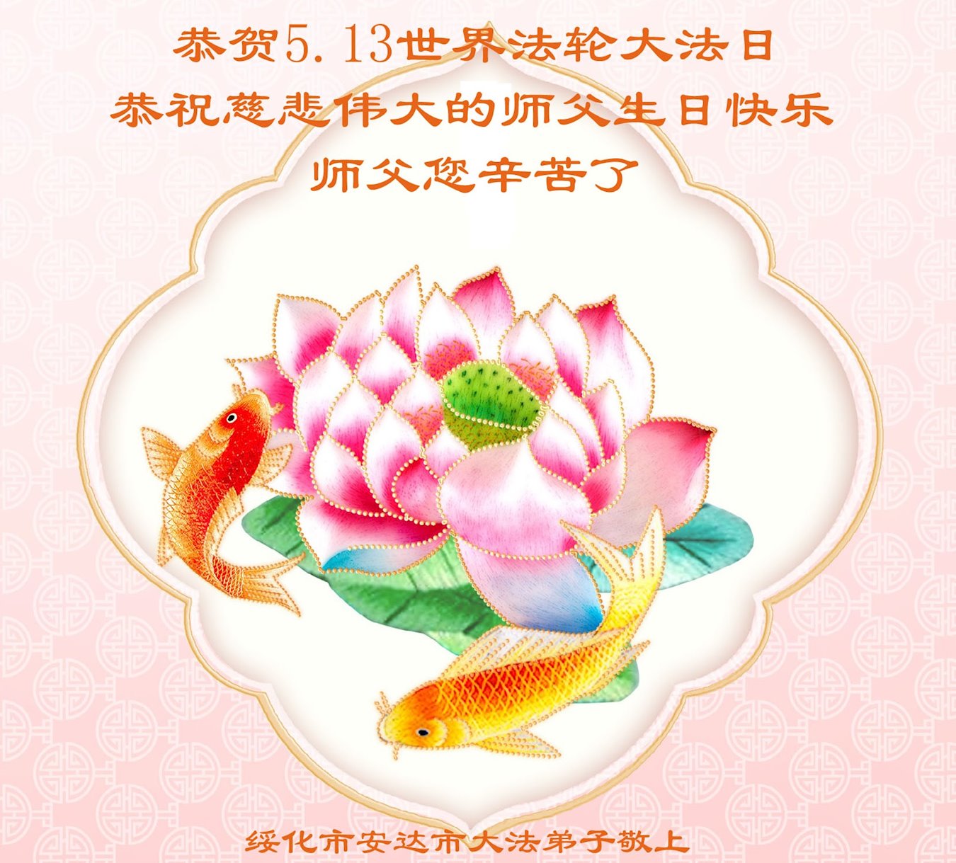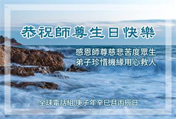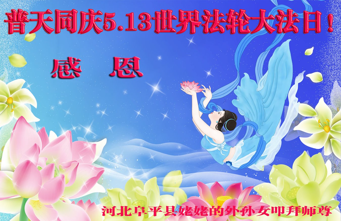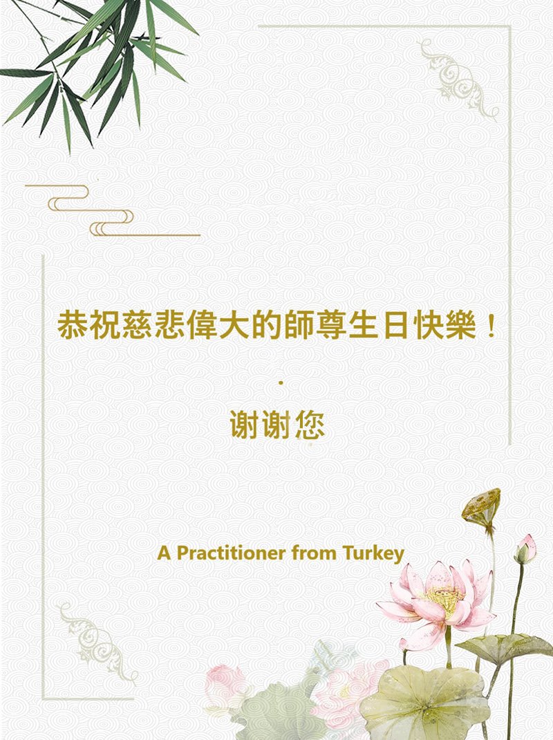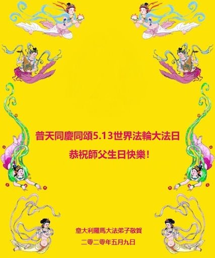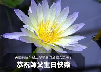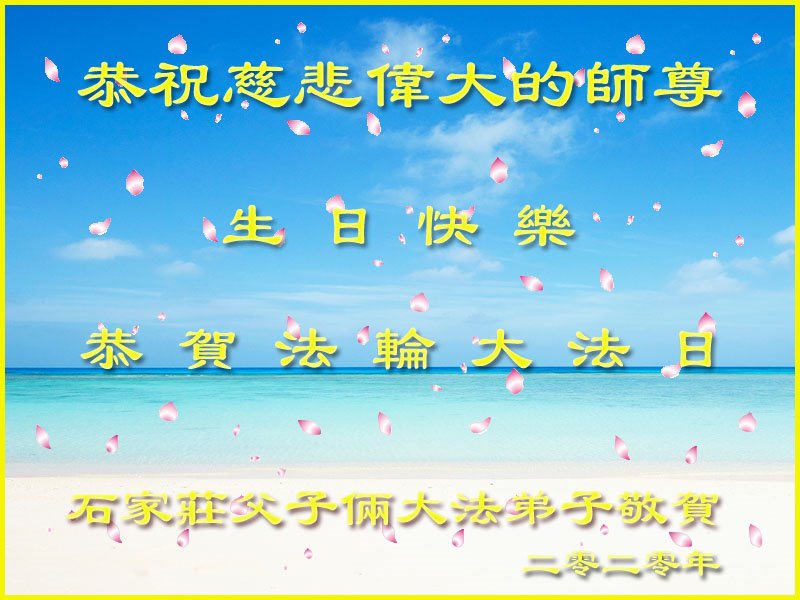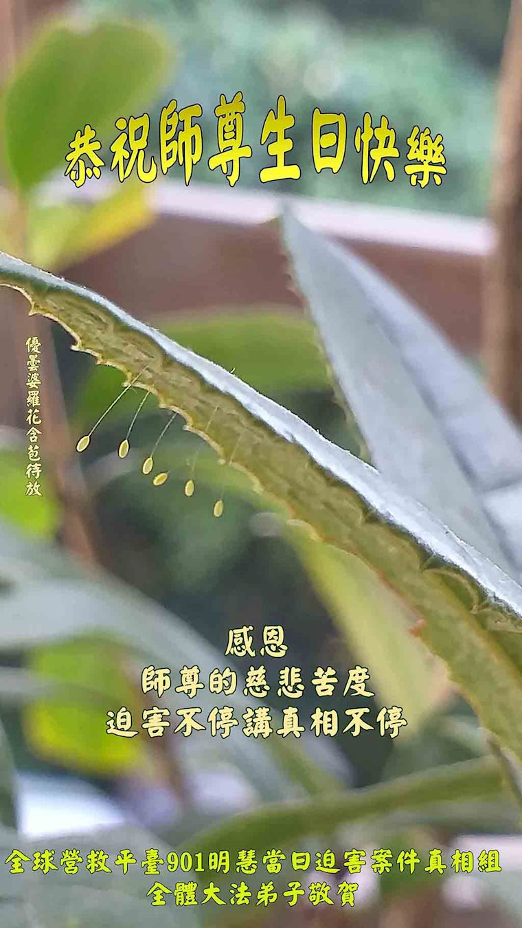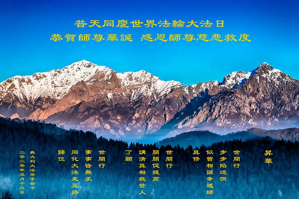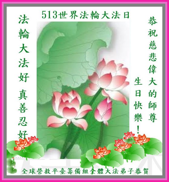 在2020年“5.13”世界法轮大法日这个殊胜的日子,我由衷地感恩师尊!感恩师尊给了我第二次生命,感恩师尊给了千千万万人第二次生命!师父说:“我洪传即是普度”(《精進要旨》〈拜师〉)。但是谁又能体会到这句话的真正涵义?普度背后的承受;普度背后的付出;普度背后的无量慈悲,都无法用人类的语言去描述。感恩师尊传出这么美好的大法,给了十恶毒世中的世人一次走向希望和光明的机会!再一次恭祝师尊生日快乐!