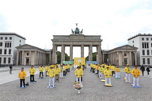 ![]() 图1~2:五月十三日德国部份法轮功学员在柏林勃兰登堡门前集体炼功。 |