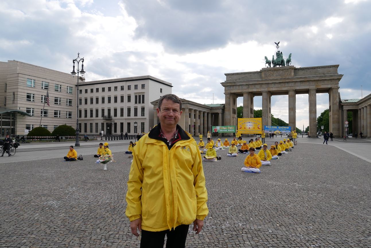 住在波茨坦的法轮功学员布洛茨(Stephan Brotze)在二零一零年得法,至今已经修炼十年了。他表示:“今天是世界法轮大法日,我来参加这里的活动,想表达对师父的感恩。”