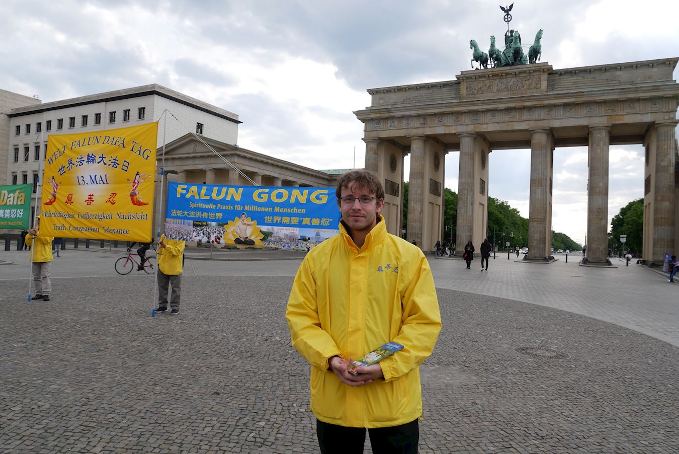 生活在柏林的法轮功学员素钦(Boris Suchin)说:“今天我来到这里是希望能让更多人了解关于法轮功的信息。在今天这个日子里,我还想表达对师父的感谢。”