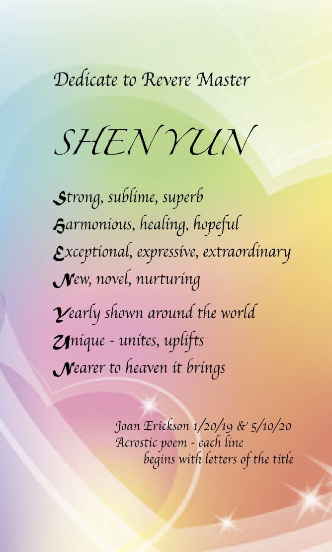 麻州法轮功学员琼·埃里克森(Joan Erickson) 得法八年,身心受益。学会遇到矛盾向内找而不是去指责他人。琼赞叹神韵的精彩,每次观赏神韵都是带着希望、流着眼泪看完演出。有感于神韵的强烈的震撼力,琼写下了《神韵》这首词,献给尊敬的师父。