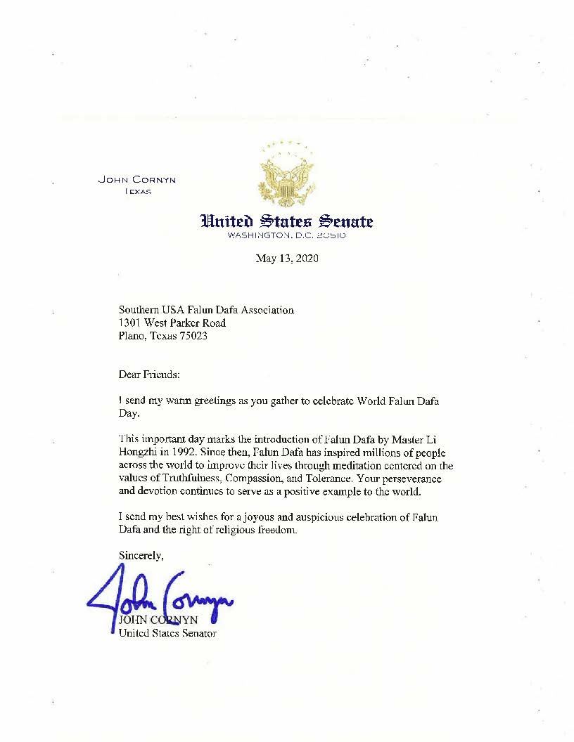 德州联邦参议员约翰·康宁(John Cornyn)在他的贺信中称:世界法轮大法日是一个重要的日子,法轮功的坚贞和毅力将继续给全世界树立着正面的榜样。