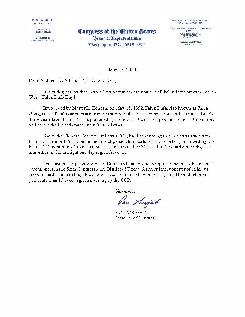 再次祝你们:世界法轮大法日快乐!作为德克萨斯州第六选区的众议员,我为能够代表选区里的这么多法轮大法修炼者感到骄傲。作为一个对信仰和人权自由的坚定支持者,我期待继续和你们一起合作,为终结中共的信仰迫害和制止强迫活摘器官而努力。
