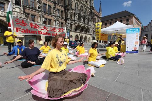 ![]() 图2:二零一八年五月十三日,伊利斯·林登迈亚(Iris Lindenmaier)在慕尼黑玛琳广场参加庆祝“世界法轮大法日”的活动。 |