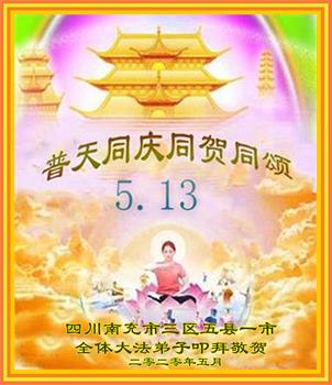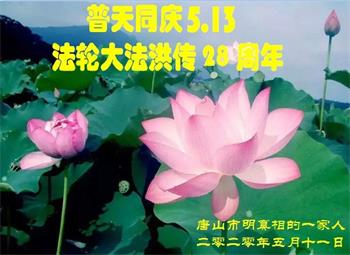 我们一起出去发大法真相资料、贴粘贴、挂条幅,条幅挂到电线杆上,一根电线杆不落全挂上。电线杆在地里,地里的黄豆苗却一颗没倒,也没人踩的脚印。全镇的电工和镇干部赶到现场,一米长的条幅上写着“法轮大法好,真善忍好”,“世界需要真善忍”,“法办江泽民”。所有到场的人个个惊讶无比,人人都说:怎么挂上去的?