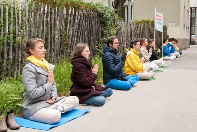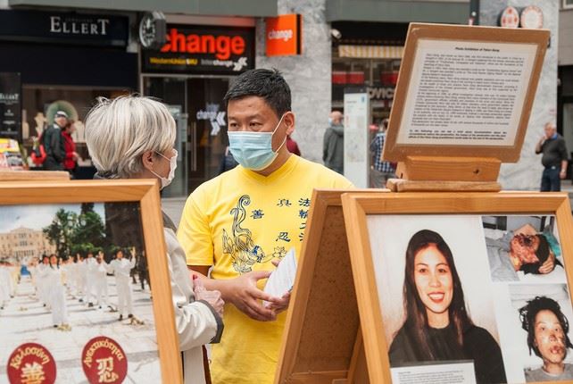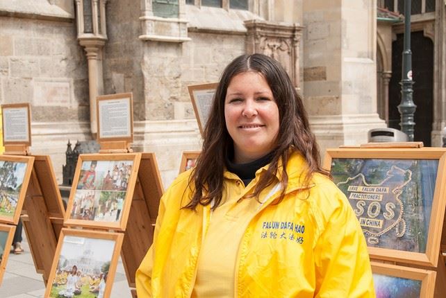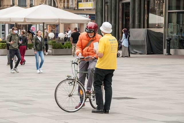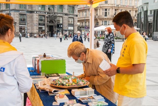 尽管需要戴口罩但是这并不影响路人了解法轮大法的真相。没有了很多游客的斯蒂芬广场较以往清净了许多。一位女士惊讶为什么法轮功会被迫害。当她看到真善忍的法理时立刻明白了,这和中共的意识形态格格不入。