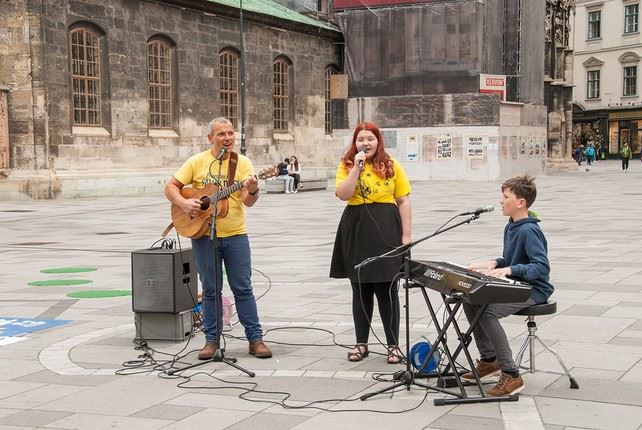 阿历克斯和他的孩子演唱了修炼和迫害法轮功的曲子。音乐使人陶醉,很多人脸上露出了笑容,他们很高兴收到法轮大法的资料。