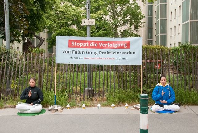 当天晚上在中使馆前学员举行了和平抗议活动。